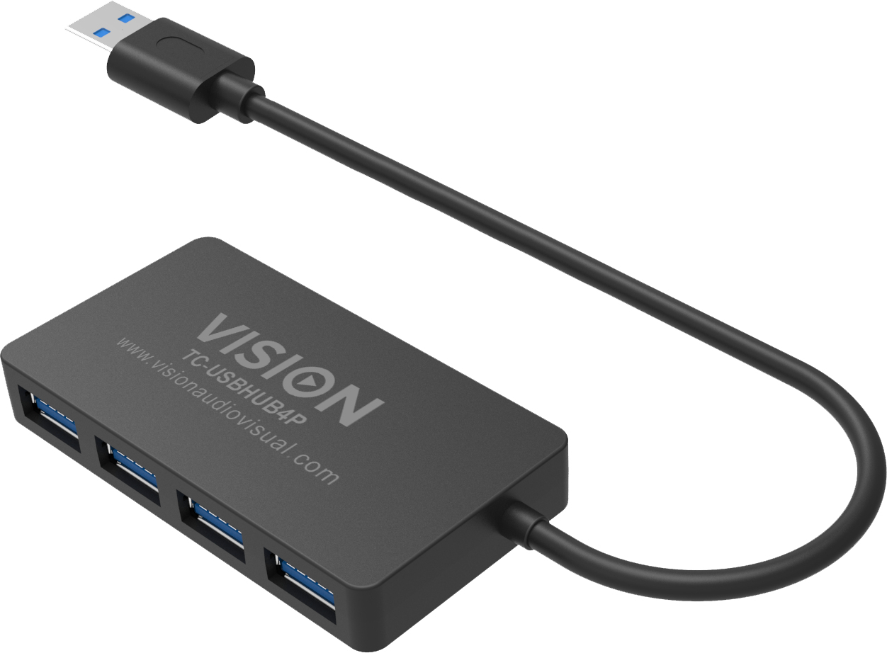 Vision TC-USBHUB4P, USB 3.2 Gen 1 (3.1 Gen 1) Type-A, USB 3.2 Gen 1 (3.1 Gen 1) Type-A, 5 Mbit/s, Zwart, China, RoHS, CE, EMC, LVD, RCM, RCM_SDOC, IC, FCC