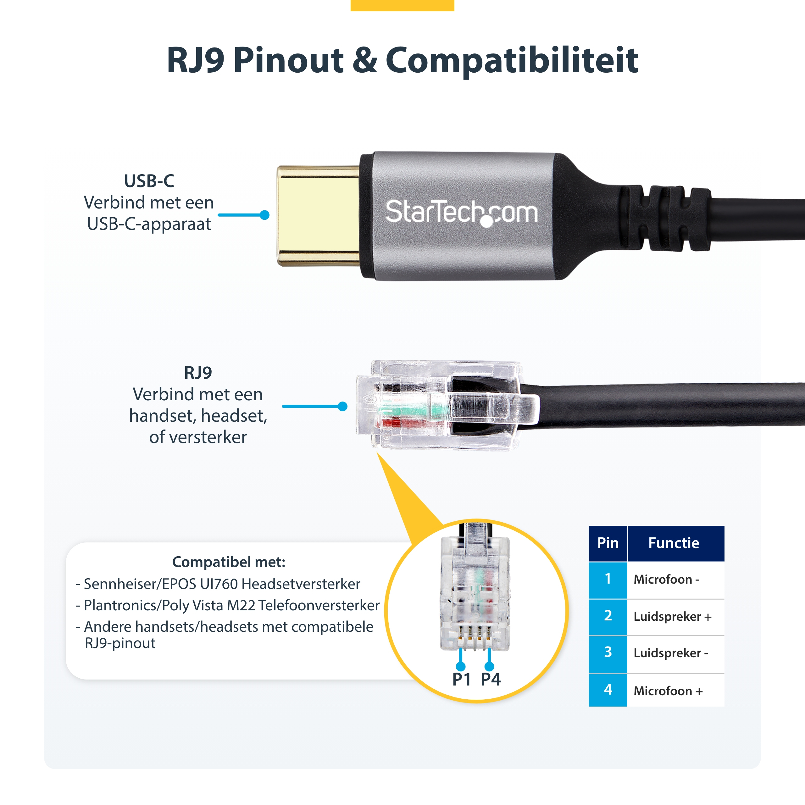 StarTech USB-C naar RJ9 Adapter voor Bureau Handset of Bedrade/Draadloze Koptelefoon, Gebruik bestaande telefoonapparatuur, 1,8m Kabel