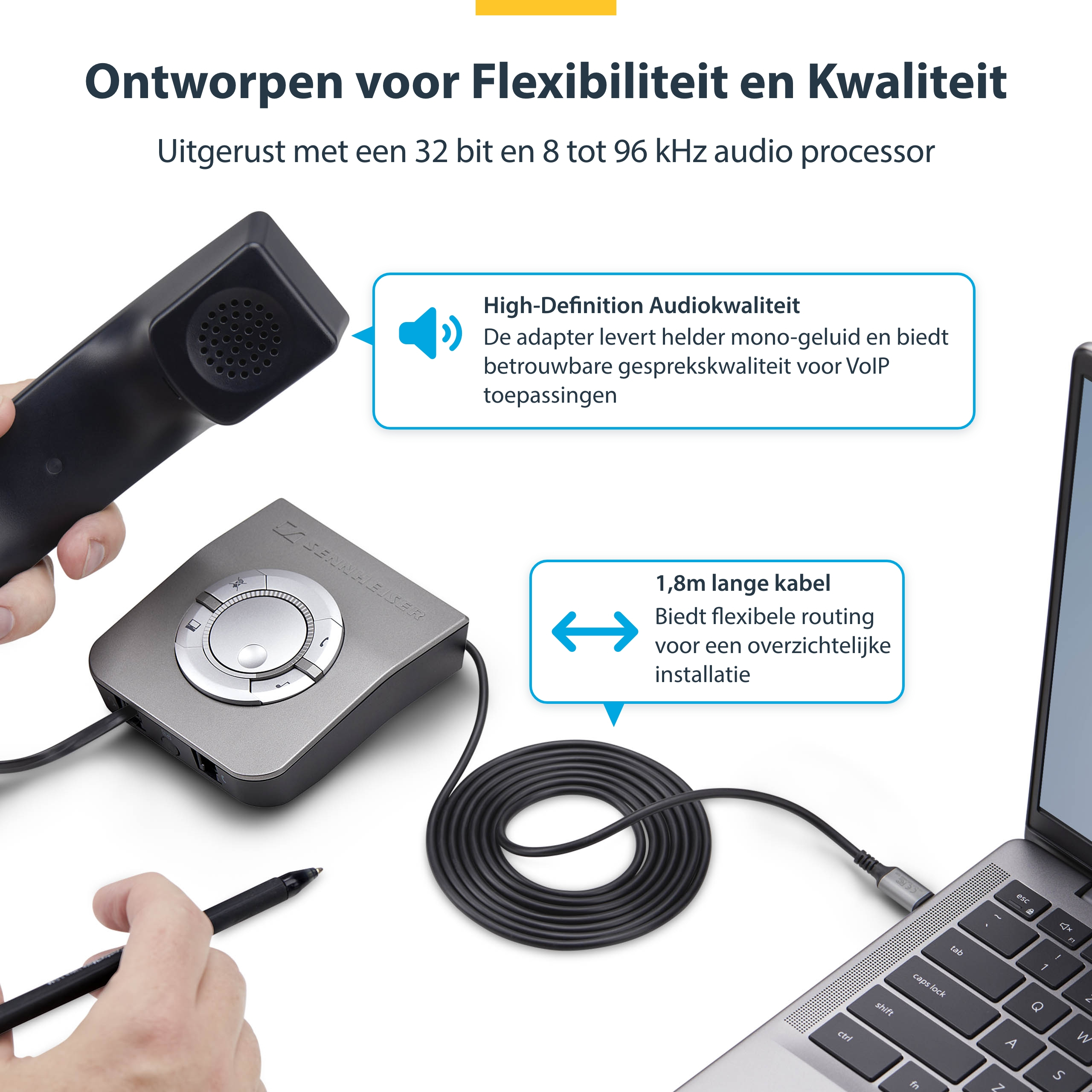 Deze kabel dongle is ideaal voor gebruikers die willen overstappen van landlijn systemen naar softphone toepassingen of voor gebruikers die de voorkeur geven aan comfort en betrouwbaarheid van hun bestaande telefoonhardware. De 1,8 m lange kabel kan flexibel rond een werkstation worden geleid, zodat er minder rommel is en de opstelling netjes blijft.