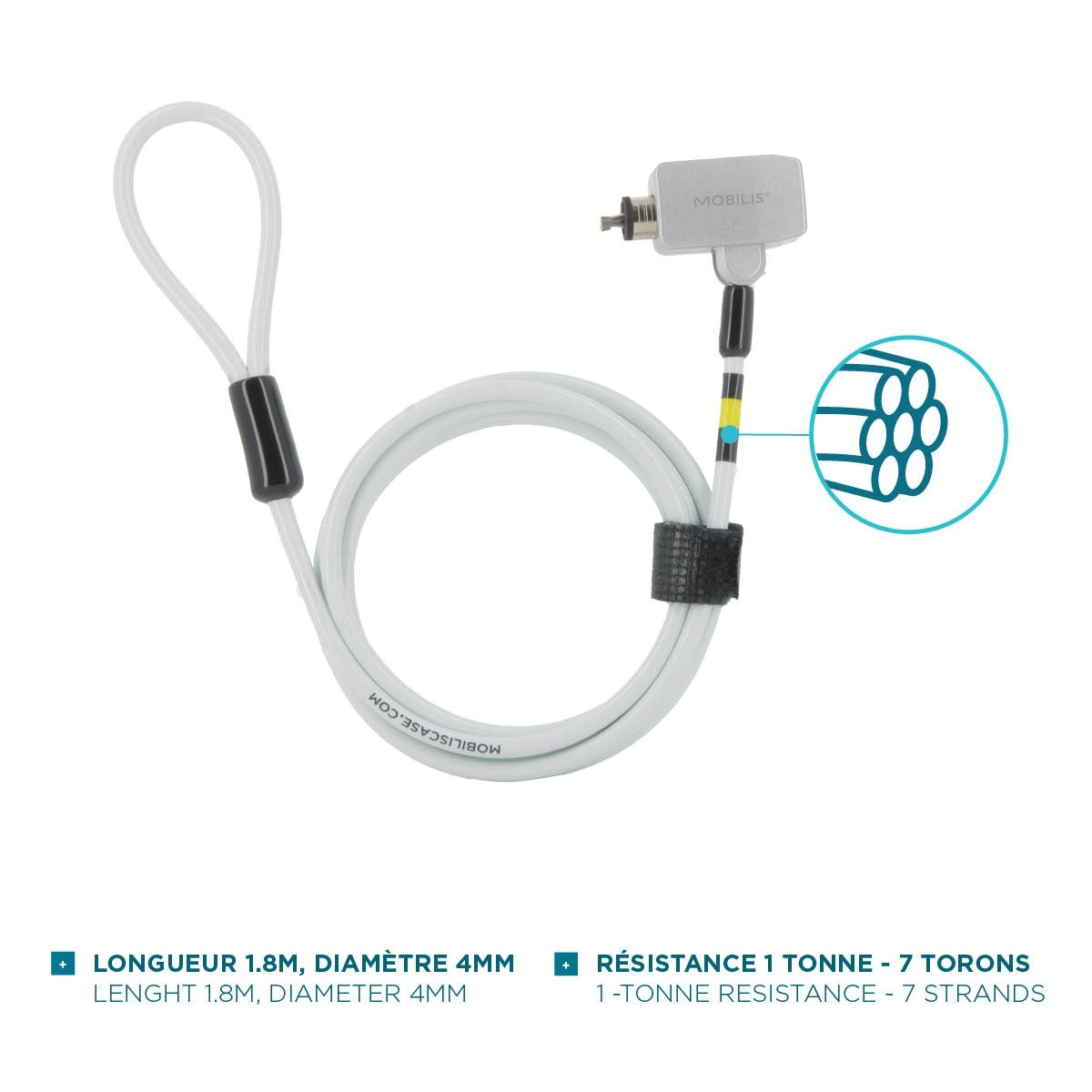 Mobilis 001393. Kleur van het product: Wit, Beste gebruik: Laptop, Slot type: Sleutel. Snoerlengte: 1,8 m, Diameter van de kabel: 4 mm. Aantal per verpakking: 1 stuk(s)