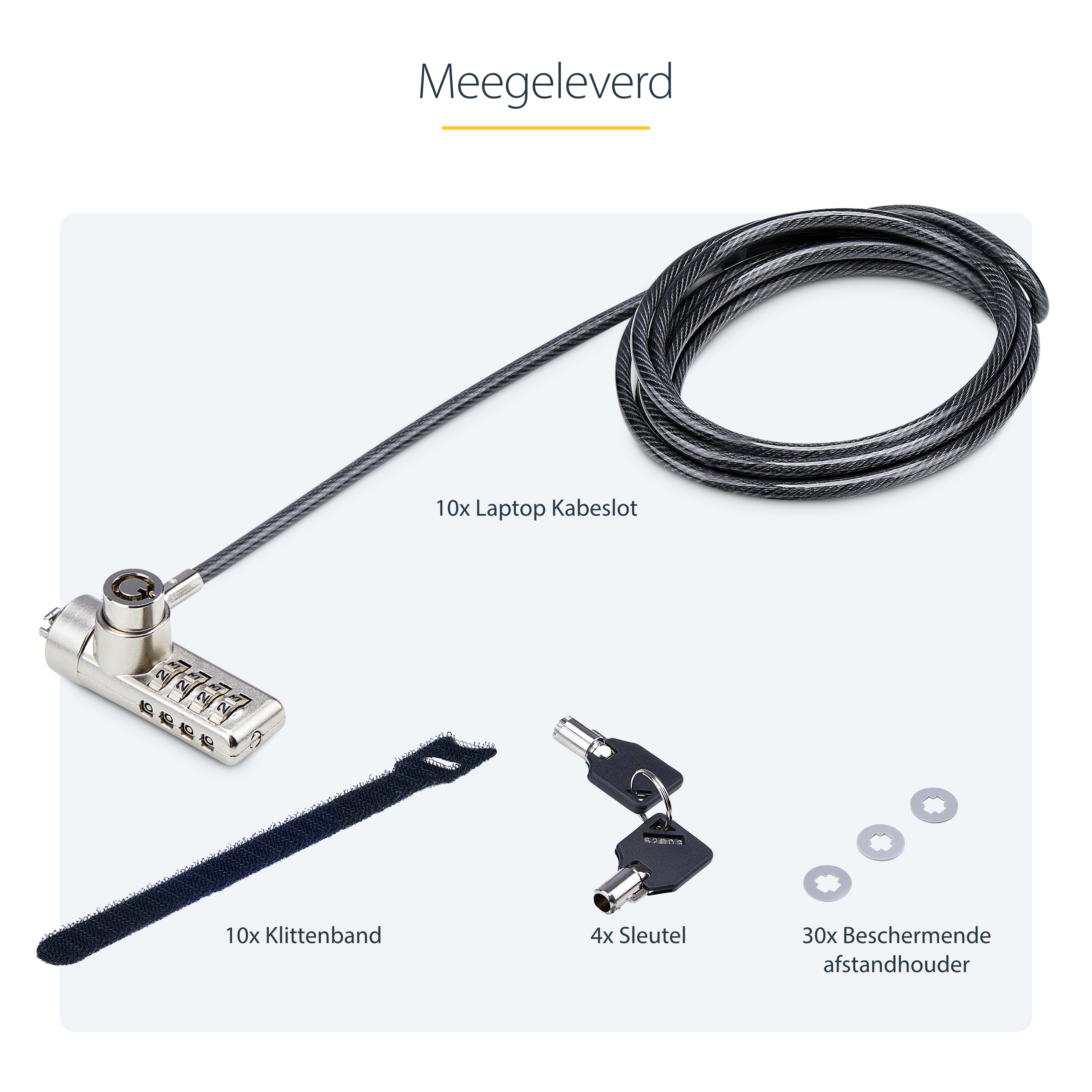 StarTech.com 10 Pack Laptopsloten met Dubbele Toegang, 2m K-Slot Kabelslot met Gelijksluitende Cilinder en Combinatieslot