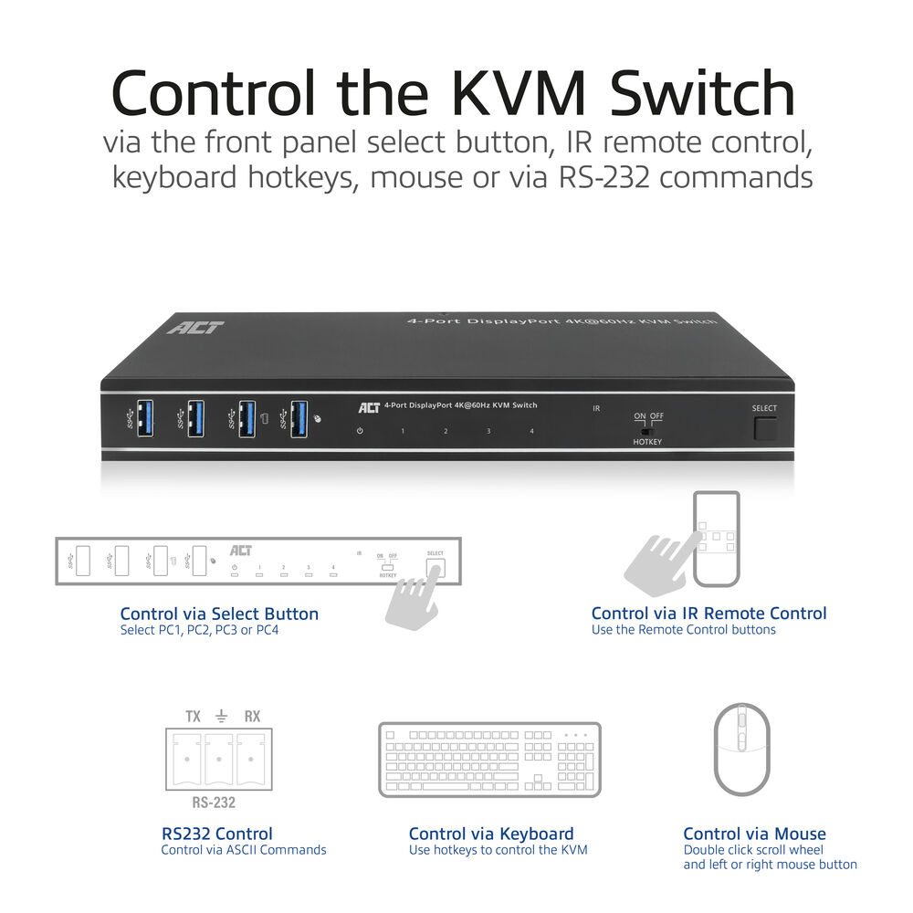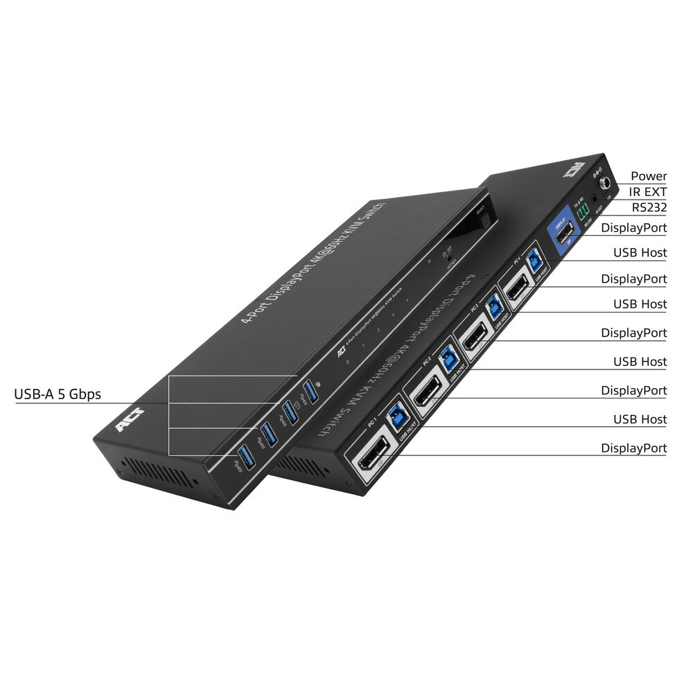 ACT 4-Poorts DisplayPort 4K@60Hz KVM Switch, 4096 x 2160 Pixels, 4K Ultra HD, 12 W, Zwart