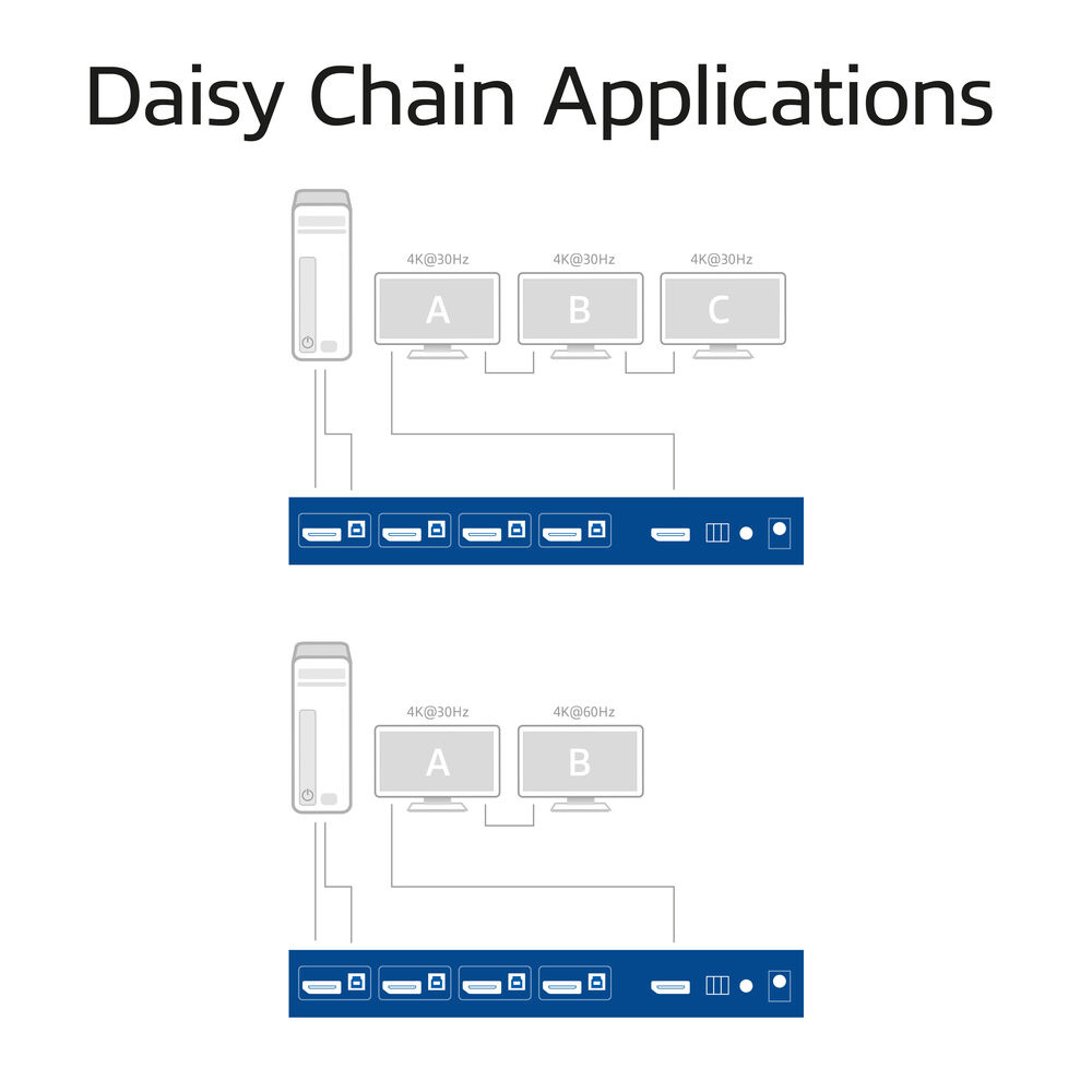 De AC7934 ondersteunt zowel SST (Single Stream Transport) als MST (Multi Stream Transport) via daisy chaining. Sluit extra monitoren aan via DisplayPort MST daisy chaining voor het uitbreiden van de desktop naar meerdere schermen (afhankelijk van de totale bandbreedte en de mogelijkheden van de bronapparaten).