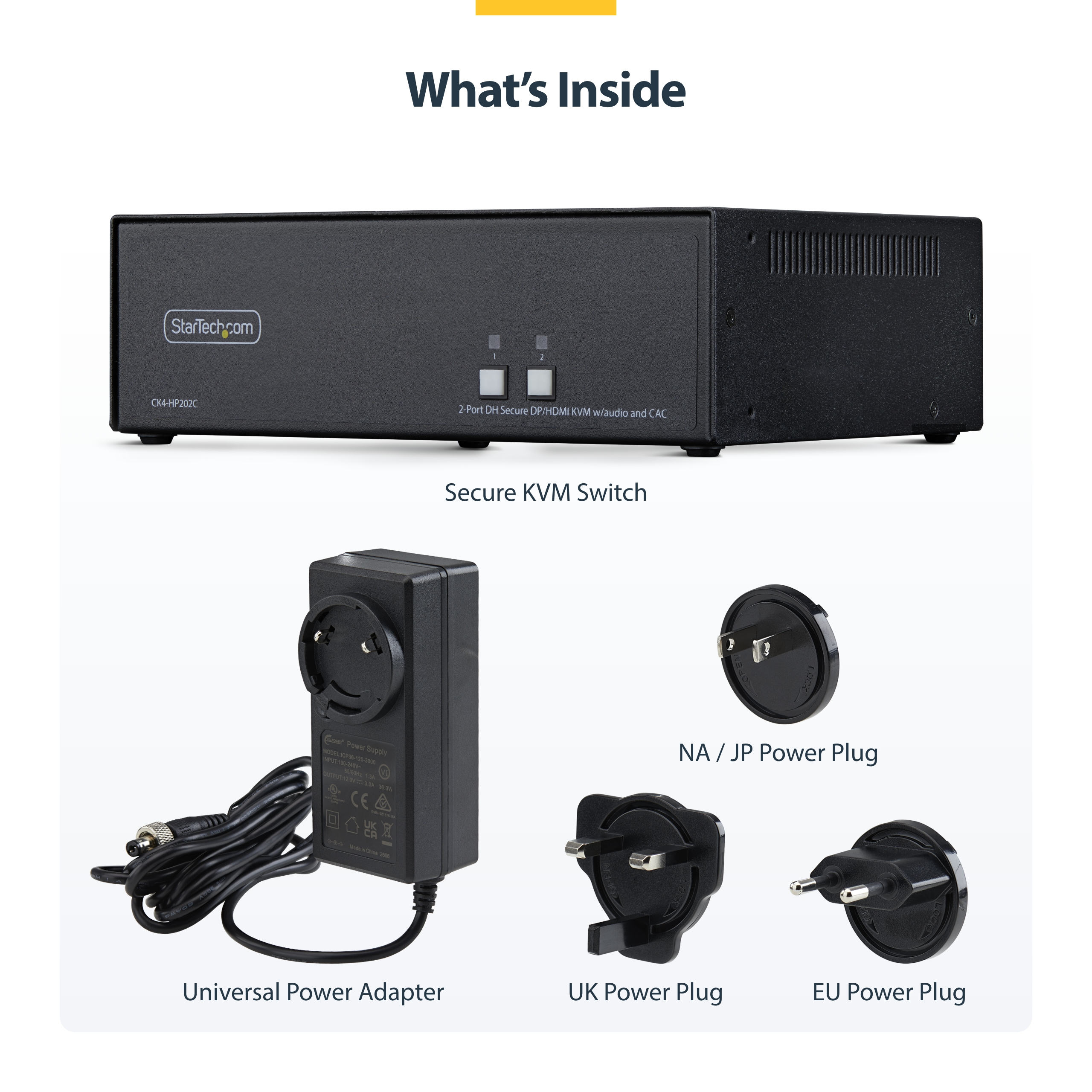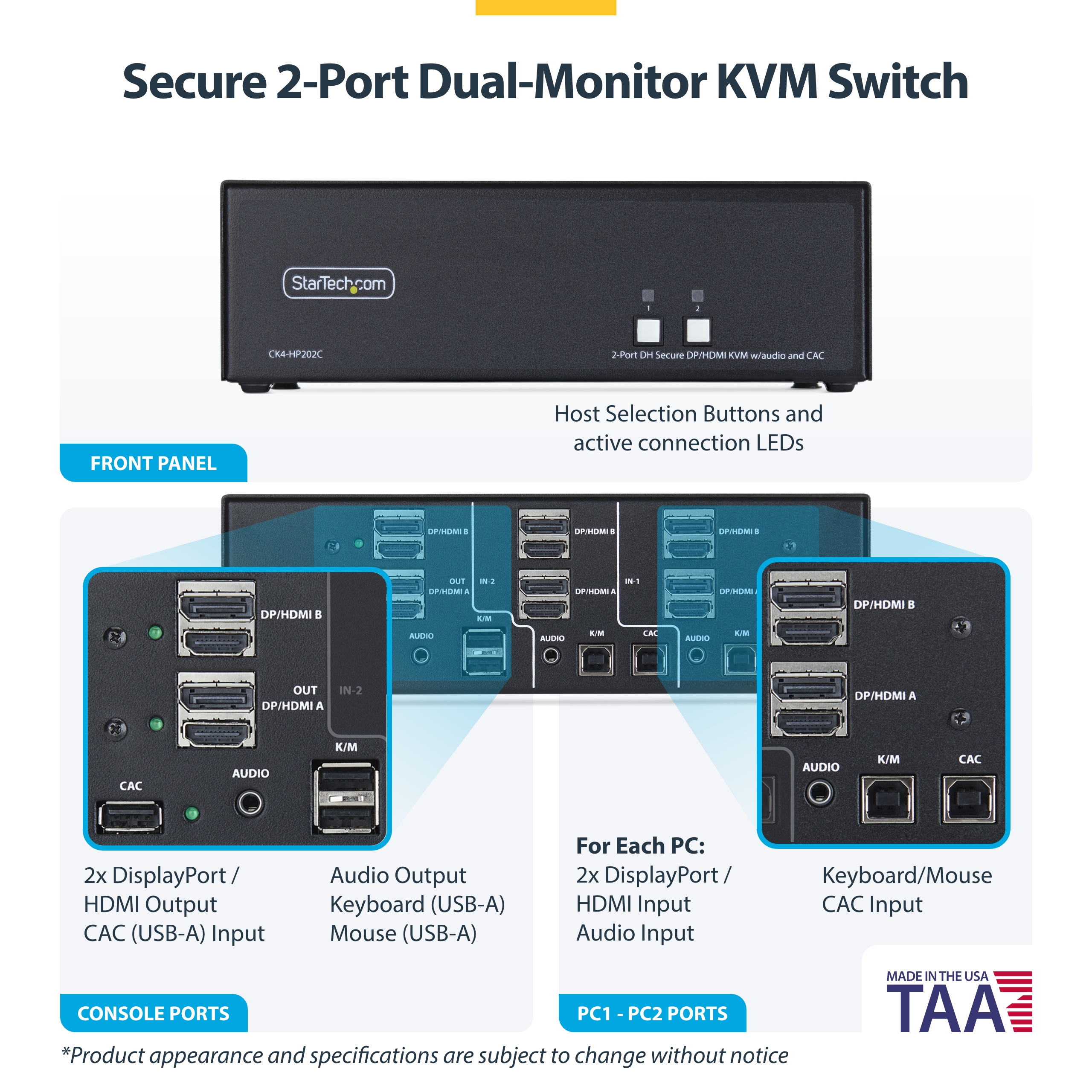 StarTech.com Secure 2-Port Dual-Monitor KVM Switch, HDMI of DisplayPort, 4K 60Hz, NIAP 4.0 Gecertificeerde Desktop KVM, Metalen Behuizing, CAC Poort, Made in USA, 3840 x 2160 Pixels, 4K Ultra HD, Zwart