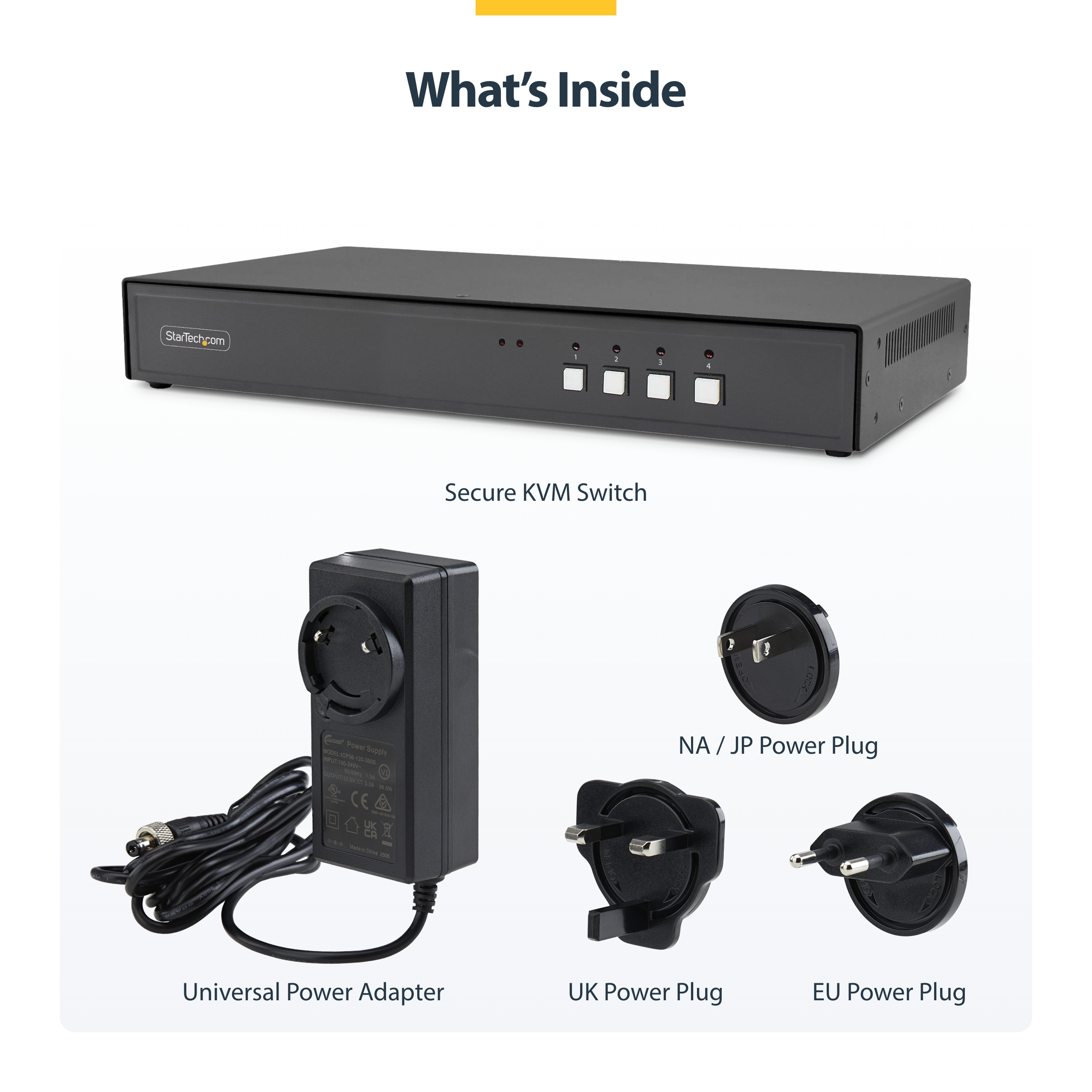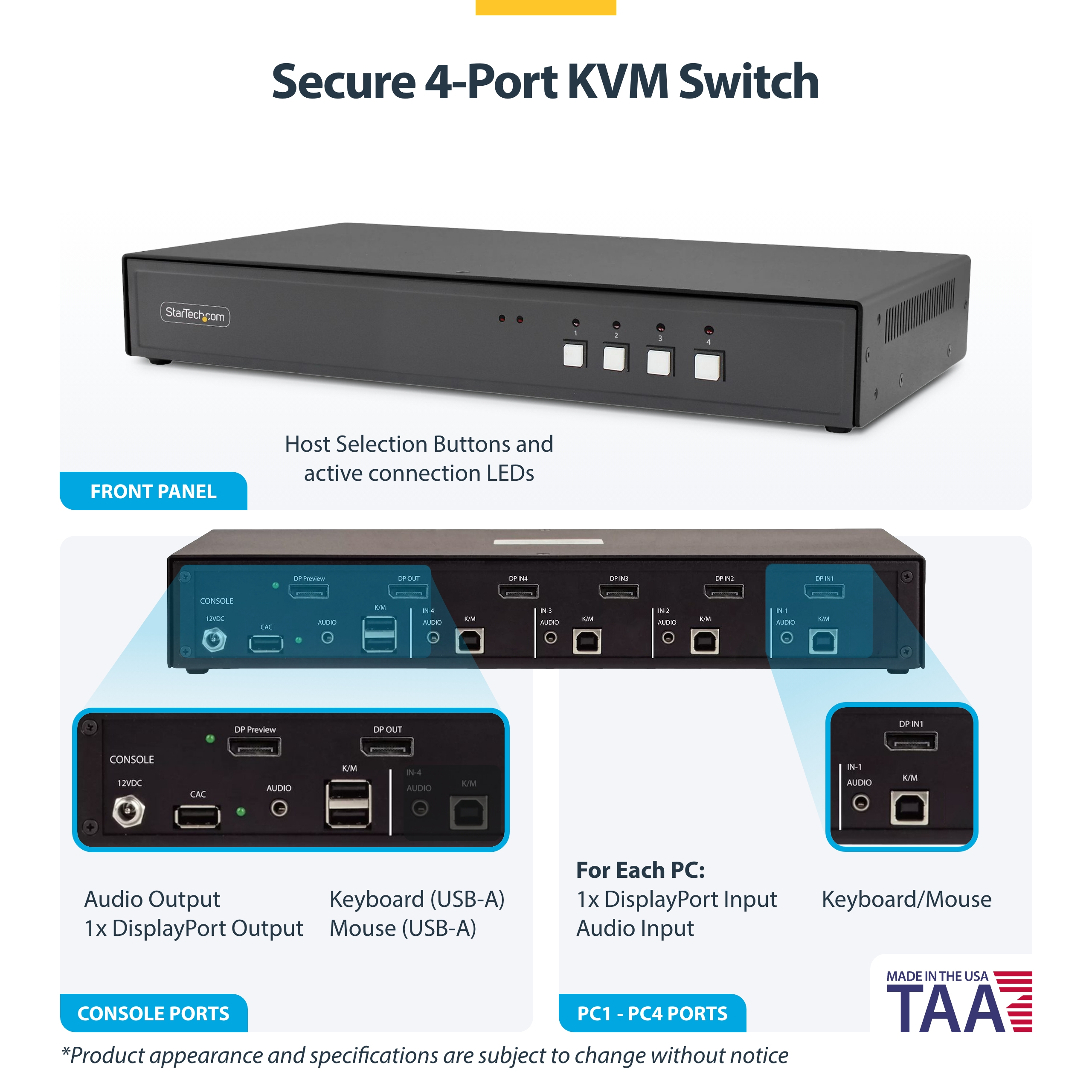 StarTech.com Secure 4-Port KVM Switch, DisplayPort, 4K 30Hz, NIAP 4.0 Gecertificeerde Desktop KVM, Metalen Behuizing, Made in USA, 3840 x 2160 Pixels, 4K Ultra HD, Zwart