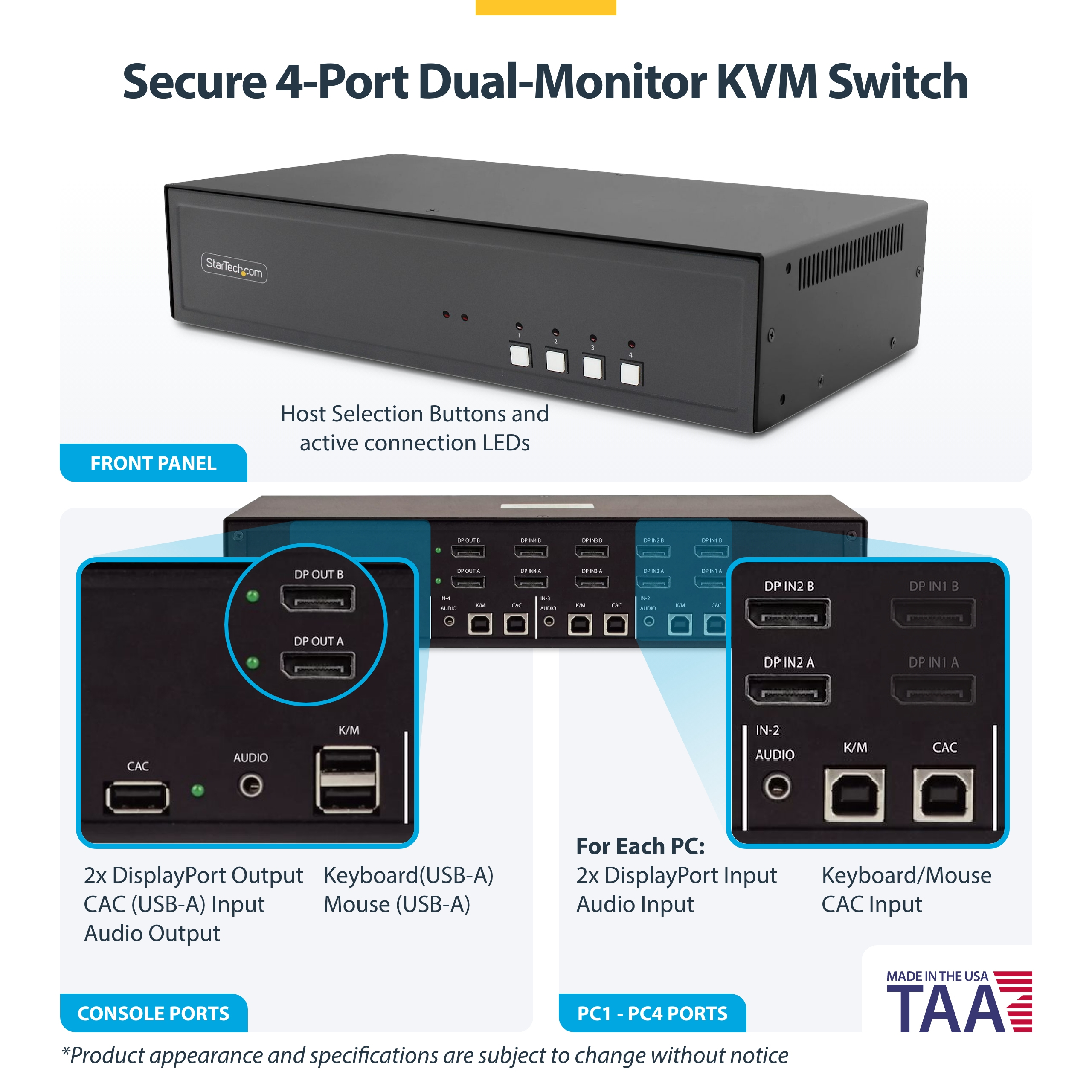 StarTech.com Secure 4-Port Dual-Monitor KVM Switch, DisplayPort, 4K 30Hz, NIAP 4.0 Gecertificeerd, CAC Poort, Made in USA