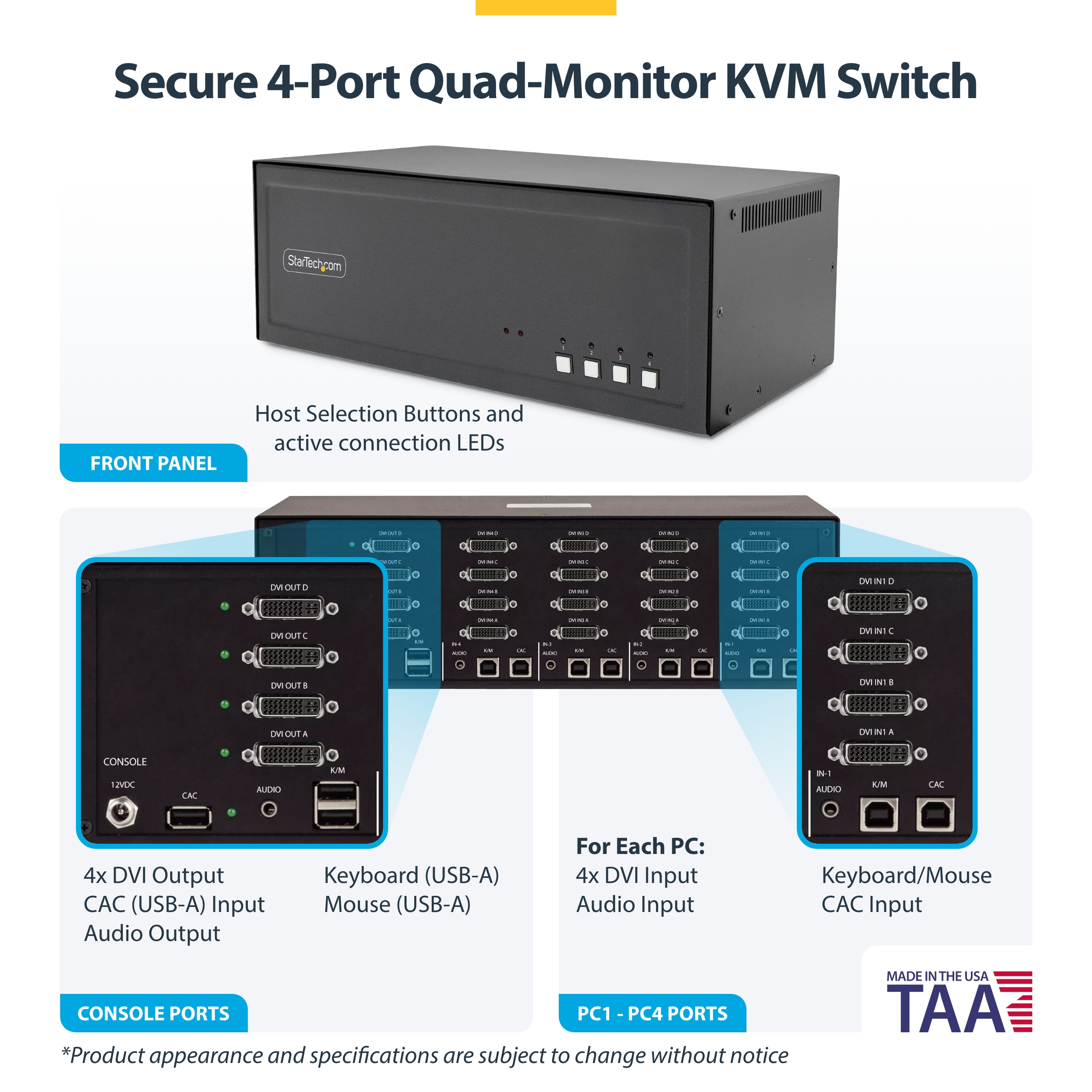 StarTech.com Secure 4-Port Quad-Monitor KVM Switch, DVI, NIAP 4.0 Gecertificeerde Desktop KVM, Metalen Behuizing, CAC Poort, Made in USA, 2560 x 1600 Pixels, WQXGA, Zwart