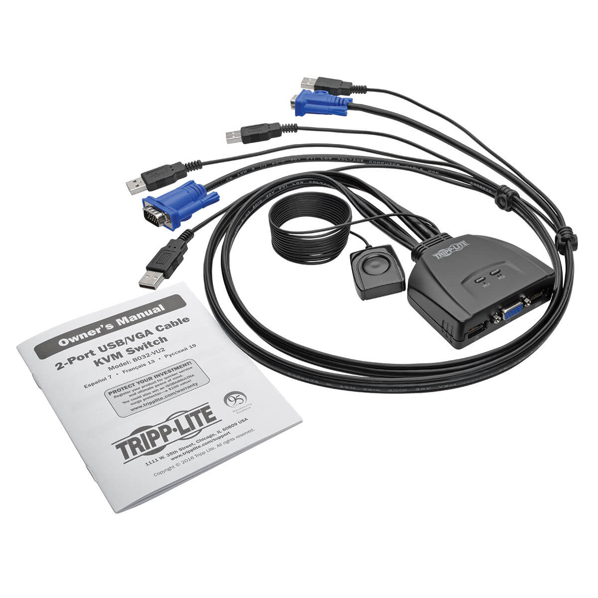 Tripp Lite B032-VU2. Aansluiting toetsenbord: USB, Aansluiting muis: USB, Aansluiting video: VGA. Maximum resolutie: 2048 x 1536 Pixels, Aantal gebruikers: 1 gebruiker(s). Kleur van het product: Zwart, Snoerlengte: 0,91 m, Maximum kabellengte: 0,91 m. Certificaten van naleving: RoHS. Breedte: 25,9 mm, Diepte: 66 mm, Hoogte: 79 mm
