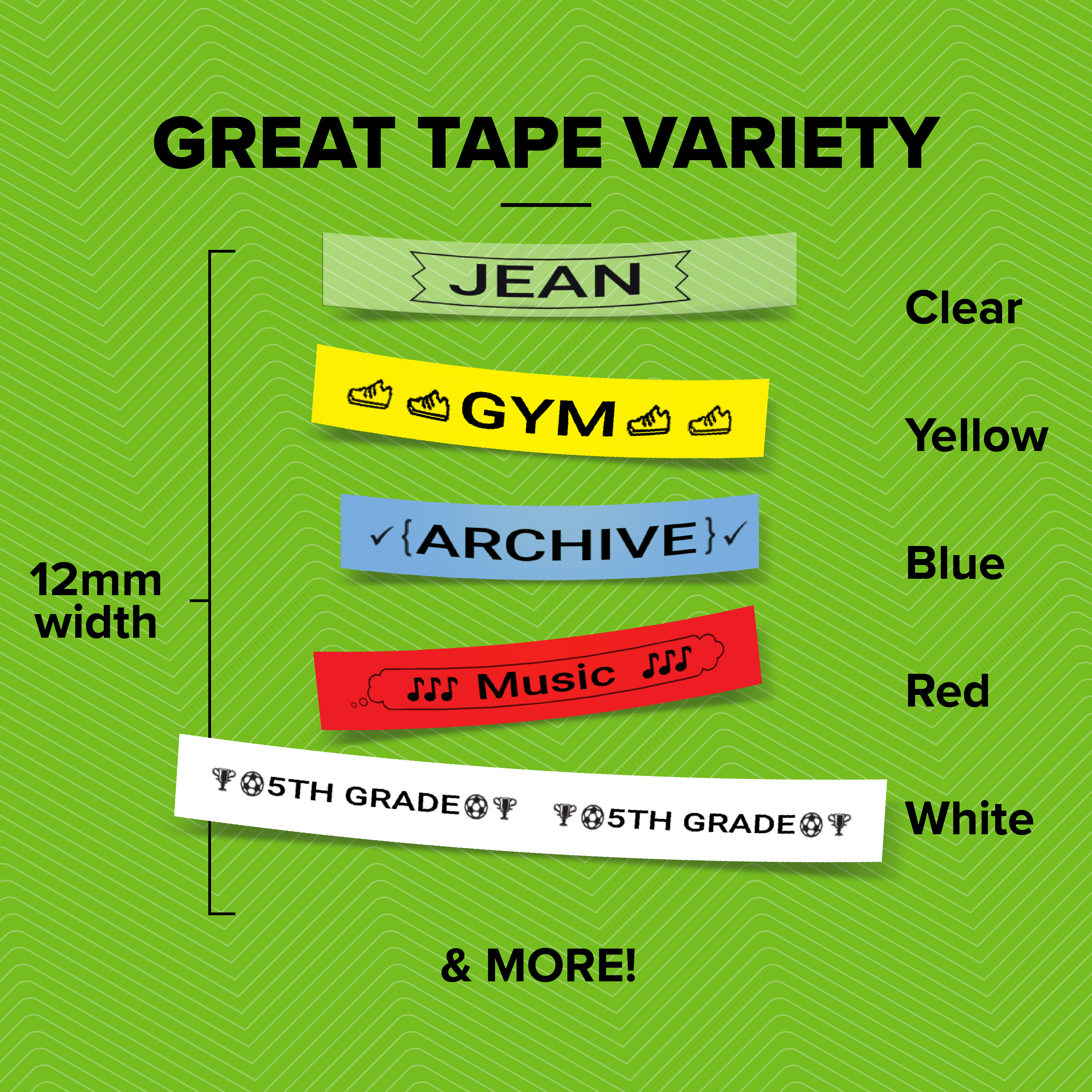 Deze tapes zijn geschikt voor elk LetraTag model. Gebruik de tapes om meer duidelijkheid te scheppen in uw kelder, garage, keuken of kantoor met een grote variatie in stijlen en een grote reeks opvallende kleuren die op de meest uiteenlopende oppervlakken kunnen worden aangebracht.