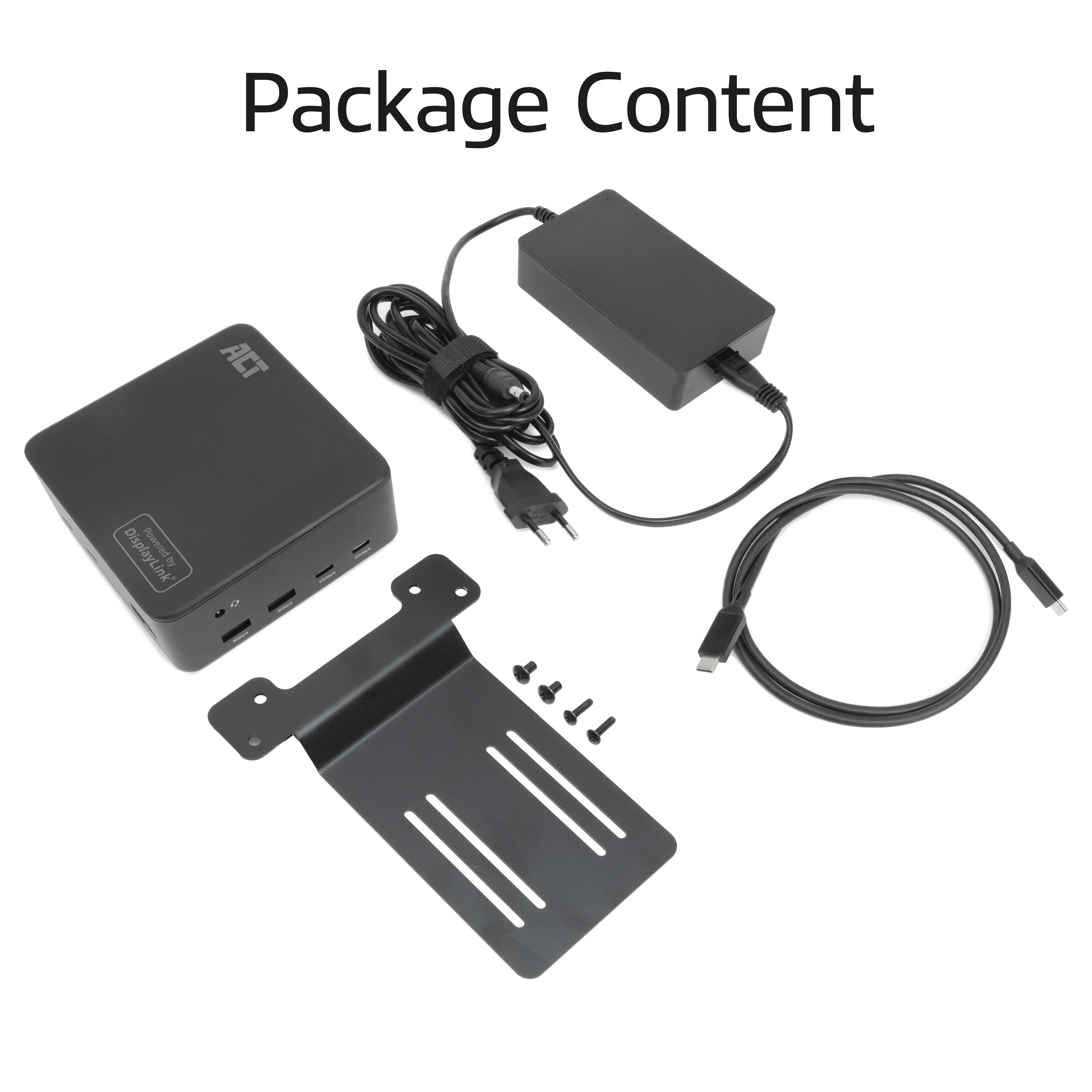 ACT Universeel USB-C Dockingstation 4K, voor 3 HDMI/DisplayPort monitoren, DisplayLink, Bedraad, USB 3.2 Gen 2 (3.1 Gen 2) Type-C, 100 W, 3,5 mm, 100,10,1000 Mbit/s, Zwart