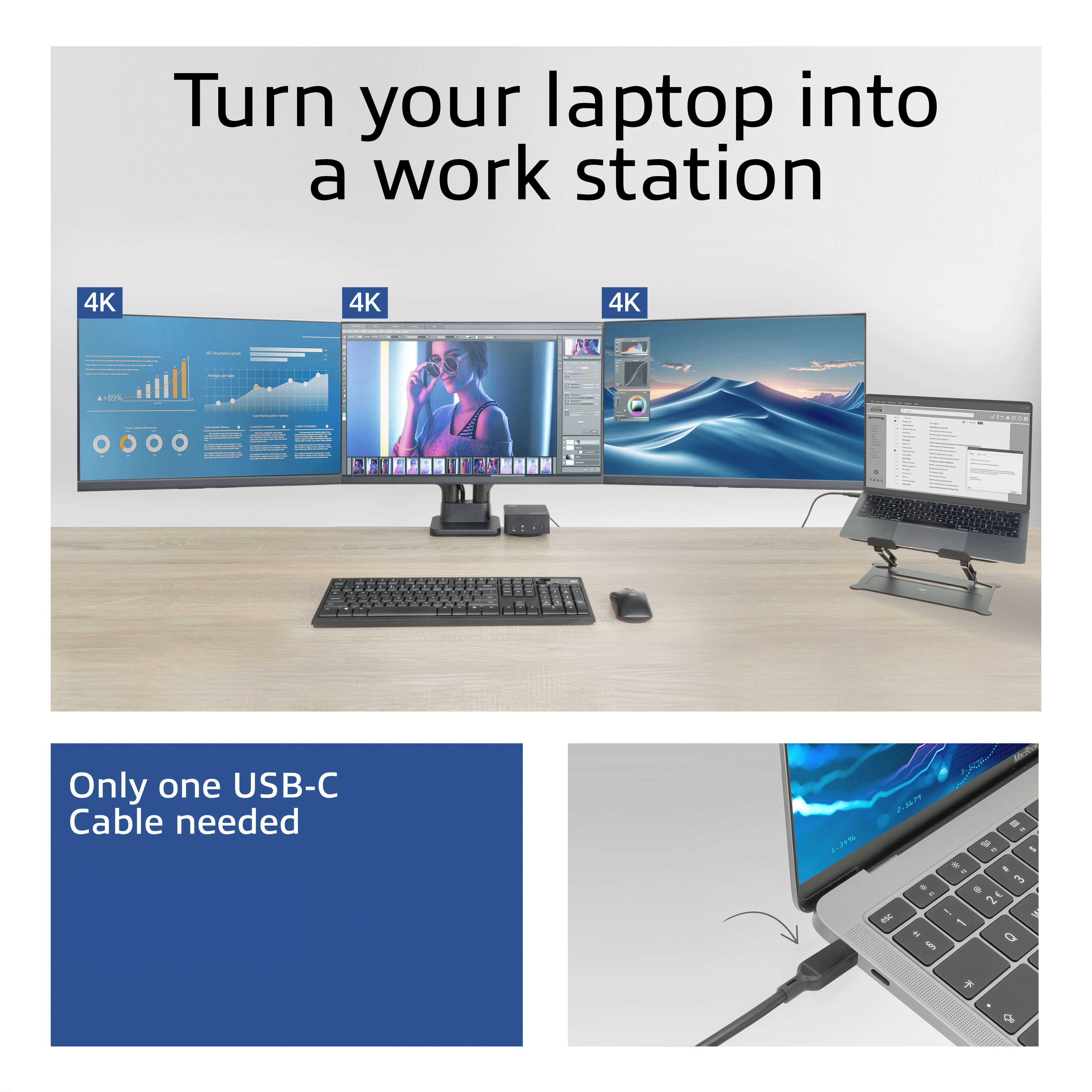 De AC7148 Triple 4K Dockingstation verandert je Windows laptop of MacBook in een compleet werkstation met slechts één USB-C-kabel. Sluit tot drie 4K-schermen HDMI/DisplayPort schermen aan voor een uitgebreide beeldschermweergave op zowel Windows als Apple laptops dankzij de ingebouwde DisplayPlay® technologie. Het dockingstation is uitgerust met een Gigabit LAN Ethernetpoort, twee USB-A-poorten, drie USB-C-datapoorten, een USB-C 20W PD poort en een headsetaansluiting.