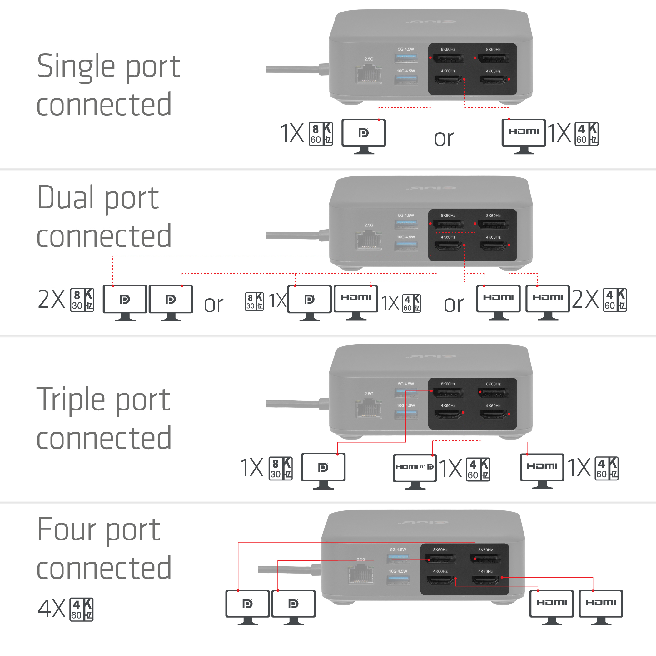 CLUB3D CSV-2542 12-1 USB-C® Quad DisplayLink Dockingstation 2x DisplayPort™ 8K60Hz + 2x HDMI™ 4K60Hz PD3.0 100Watt Ethernet 2.5G, Docking, USB 3.2 Gen 2 (3.1 Gen 2) Type-C, 100 W, 3,5 mm, 10,100,1000,2500 Mbit/s, Zwart