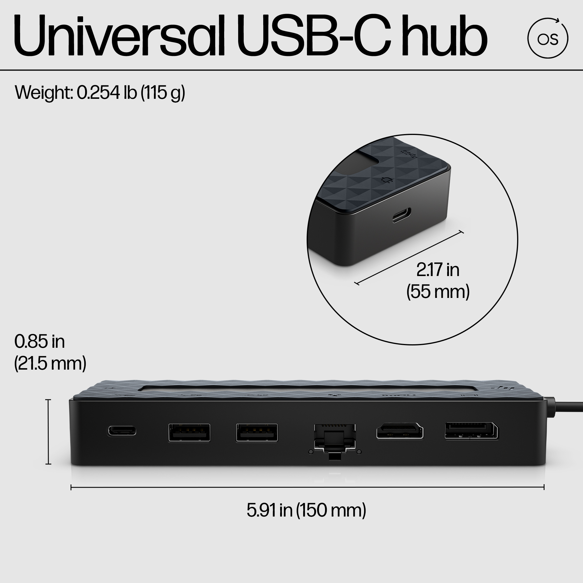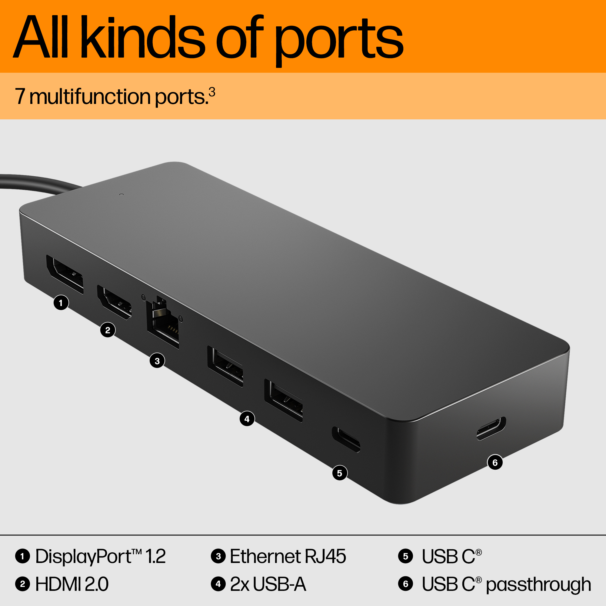 Ontdek de mogelijkheden van de HP Universal USB-C Multiport hub[1], die nu elke met USB-C[1] compatibele pc ondersteunt. 7 poorten, 1 stroom- en datadoorvoerkabel, en veel randapparatuur om via plug-en-play aan te sluiten. Hij ondersteunt ook twee 4K-beeldschermen via HDMI 2.0 en DisplayPort™ 1.2. Deze hub is alles wat je nodig hebt om verbonden te blijven.