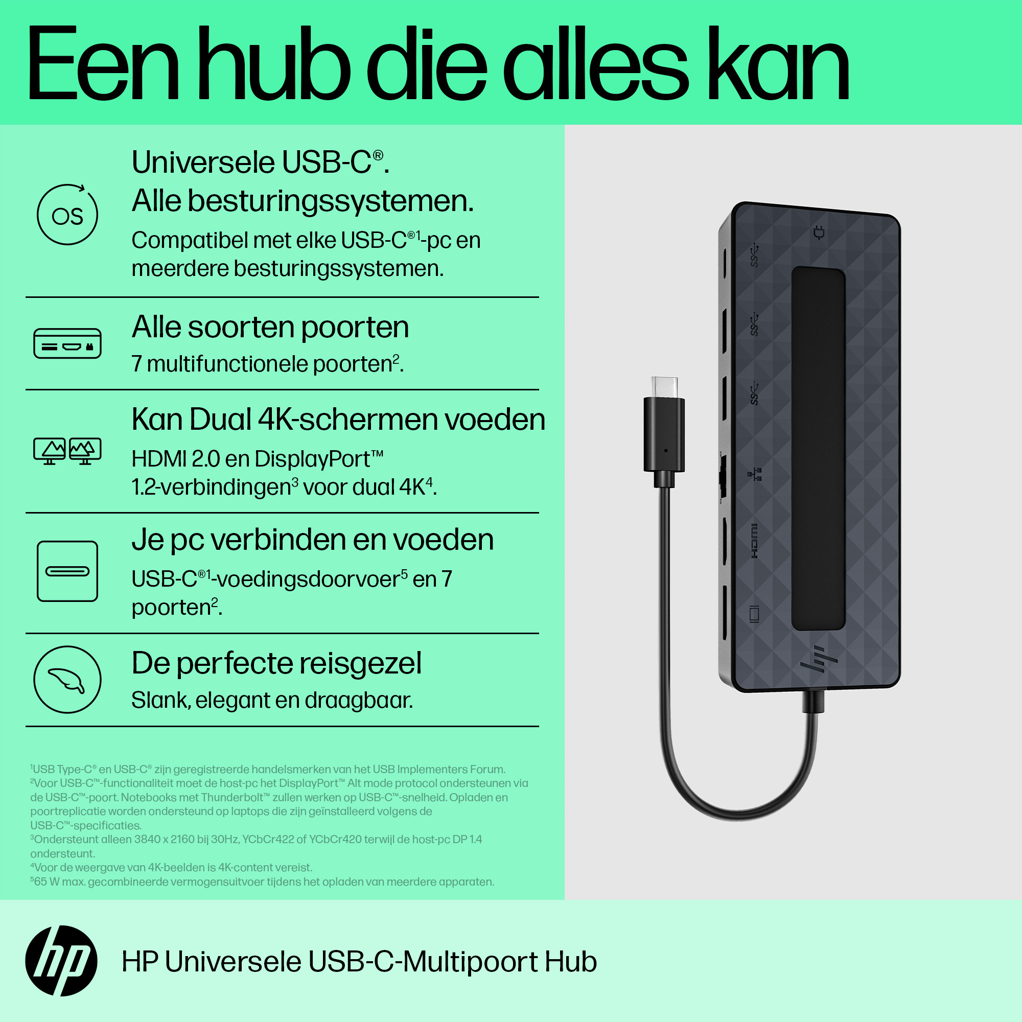 HP Universal USB-C Multiport Hub, Docking, USB 3.2 Gen 2 (3.1 Gen 2) Type-C, Zwart, 4K Ultra HD, 60 Hz, DisplayPort, HDMI, RJ-45, USB 3.2 Gen 1 (3.1 Gen 1) Type-A, USB 3.2 Gen 1 (3.1 Gen 1) Type-C