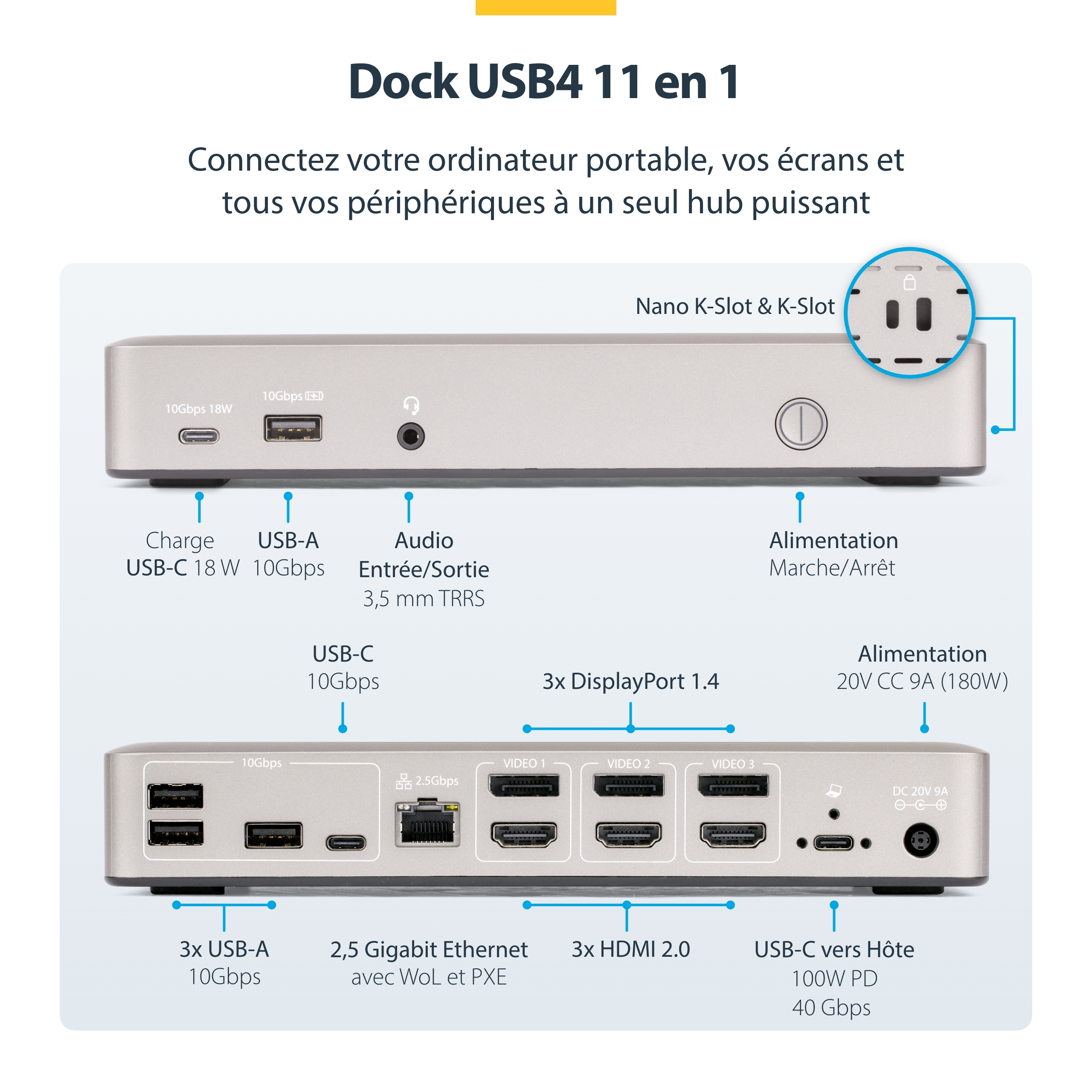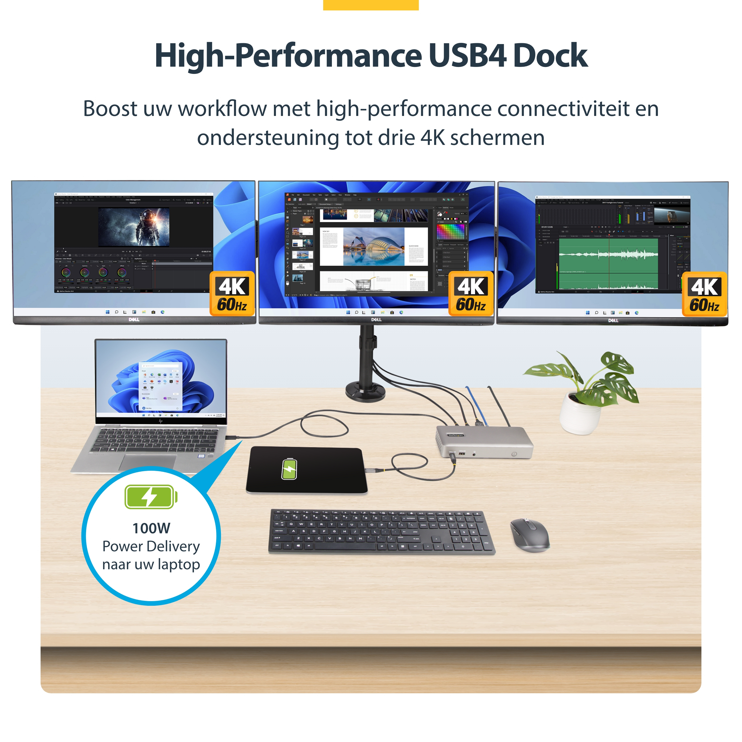 StarTech.com Triple-Monitor USB4 Docking Station, 4K 60Hz HDMI of DisplayPort, 100W Laptop Charging, 2.5GbE, USB-C Multi-Monitor Dock, Zonder Drivers, Bedraad, USB4, 3,5 mm, 10,100,1000,2500 Mbit/s, Grijs, 40 Gbit/s