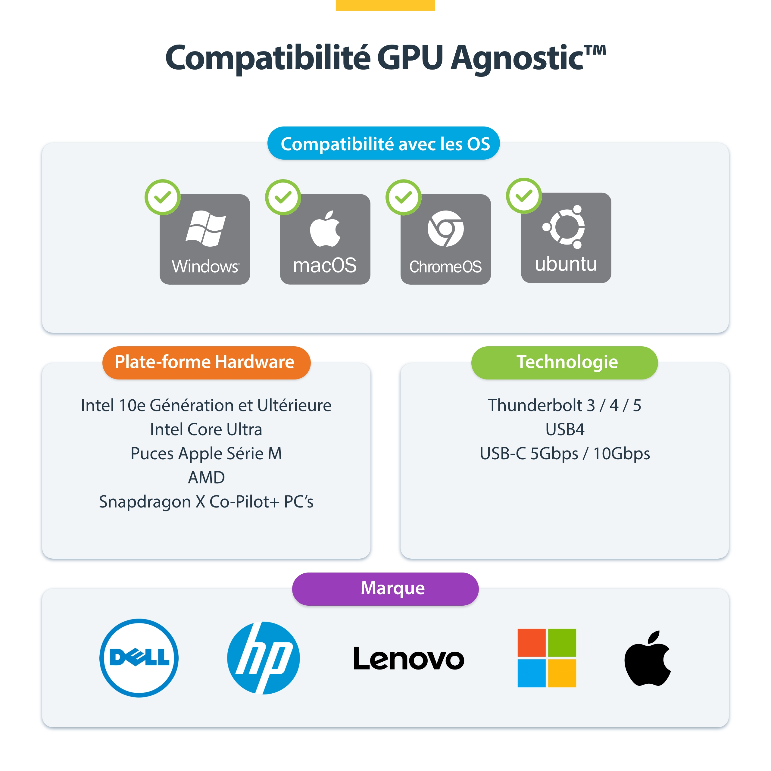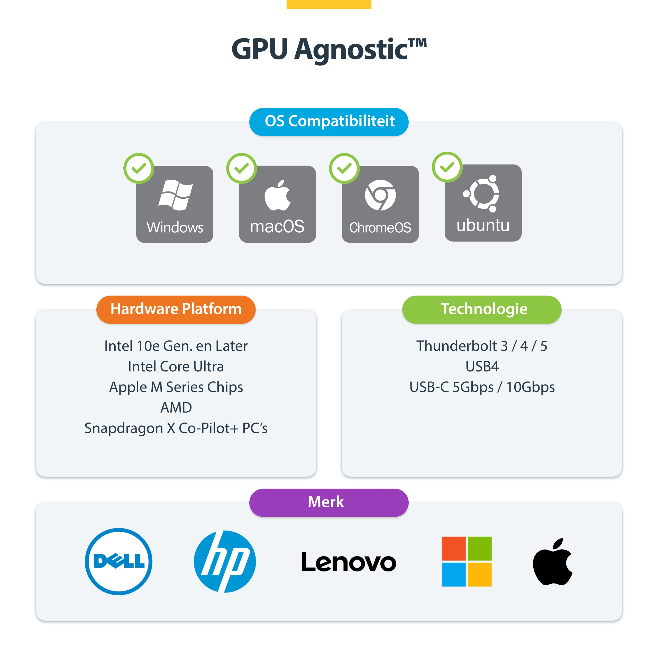 Sluit het dock aan op uw hostcomputer met behulp van de 1 m lange meegeleverde USB-C-kabel. Het dockingstation ondersteunt alle belangrijke besturingssystemen, waaronder Windows, macOS, ChromeOS en Ubuntu. Dit dock is ontworpen voor probleemloze integratie met elk compatibel, USB-C apparaat binnen uw organisatie, waaronder Lenovo X1/Thinkpad P-serie, Dell Latitudes/Precision/XPS 15, HP Envy, Surface Laptop 3, en M1 Pro/Max/M2 MacBooks. Het dock is voorzien van een zijdelingse K-sleuf voor extra veiligheid in gedeelde werkruimten (bijv. BYOD hoteling/hot-desking).