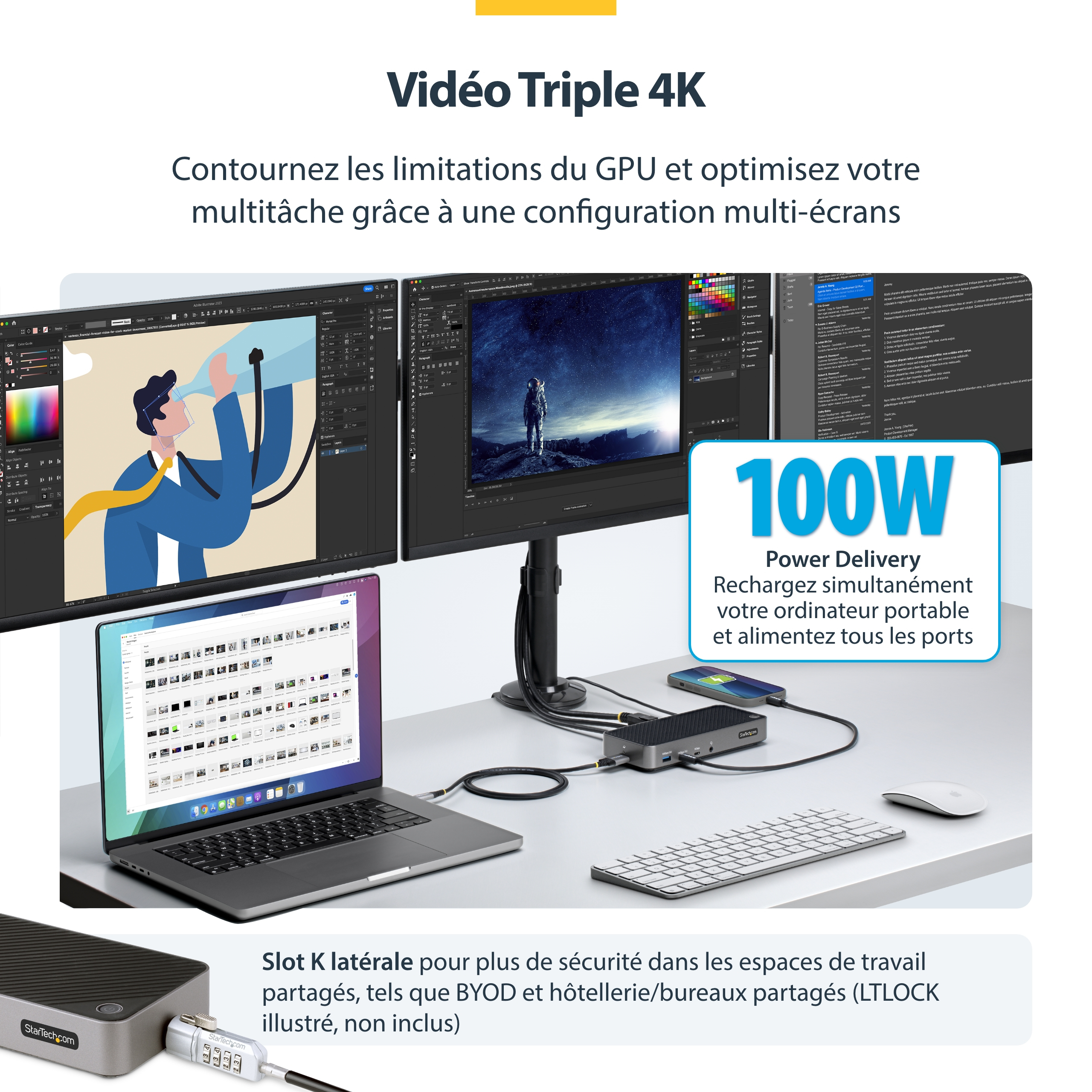 Dankzij dit USB-C Triple 4K Monitor Docking Station kunt u een flexibel workstation bouwen compatibel met USB-C, of Thunderbolt 3/Thunderbolt 4 laptops, en bovendien met meerdere combinaties van Ultra HD 4K DisplayPort en HDMI monitors.