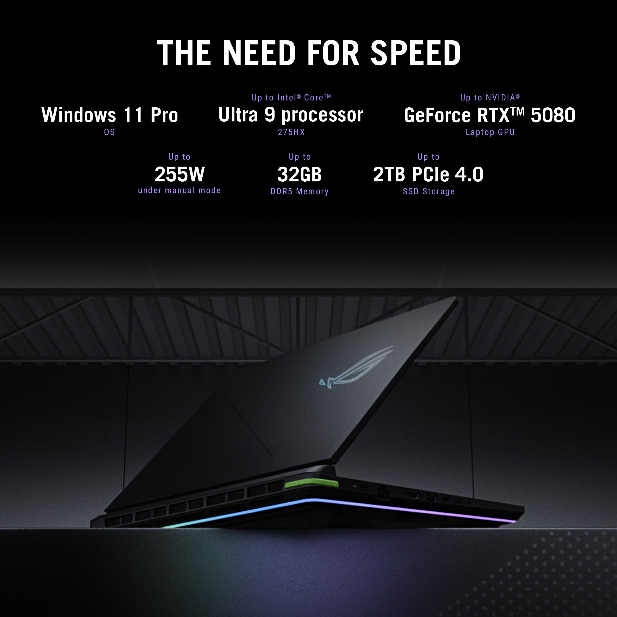 Domineer Windows 11 Pro gaming met tot een Intel® Core™ Ultra 9 processor 275HX en tot een NVIDIA® GeForce RTX™ 5080 Laptop GPU met een max. TGP van 175 W.