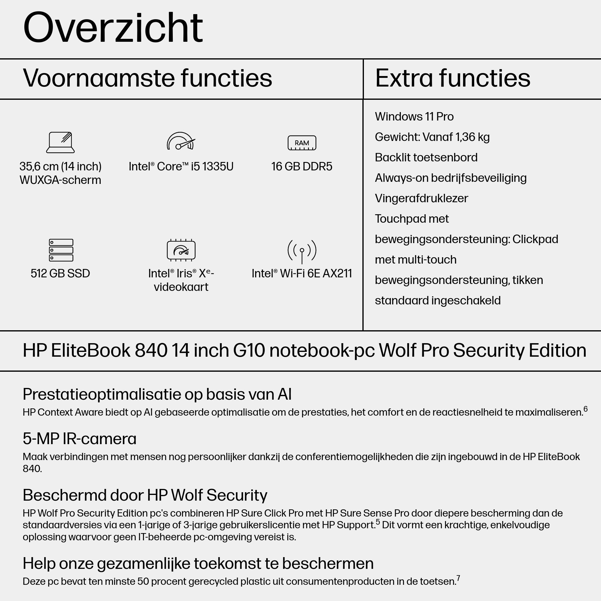 EliteBook 840 14 inch G10 notebook-pc Wolf Pro Security Edition, 14", Windows 11 Pro, Intel® Core™ i5, 16GB RAM, 512GB SSD, WUXGA