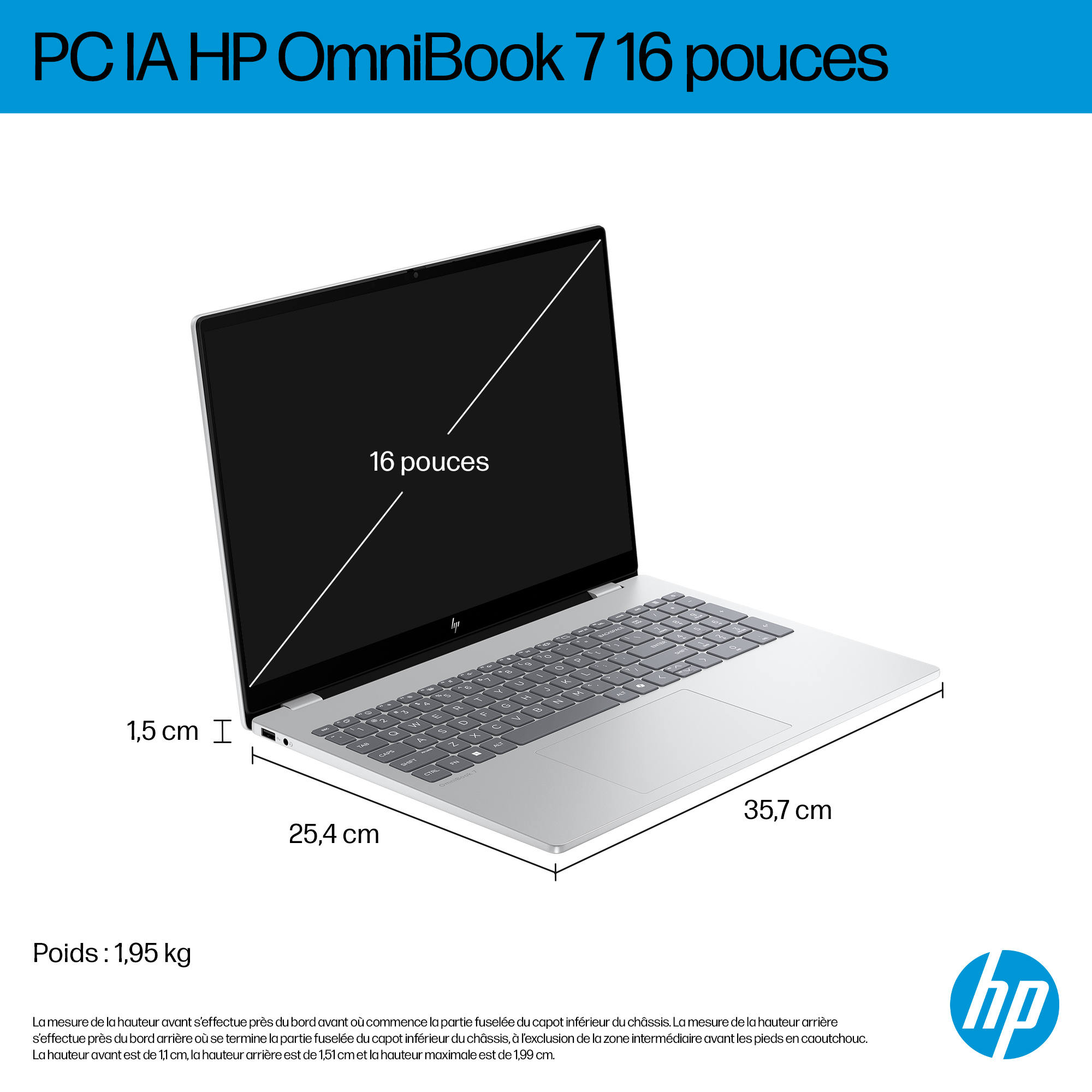 HP OmniBook 7 AI 16-ay0772nb. Type product: Laptop, Vormfactor: Clamshell. Processorfamilie: Intel Core Ultra 7, Processormodel: 255H, Frequentie van processor: 2 GHz. Beeldschermdiagonaal: 40,6 cm (16"), HD type: 2K, Resolutie: 2048 x 1280 Pixels, Touchscreen. Intern geheugen: 32 GB, Intern geheugentype: DDR5-SDRAM. Totale opslagcapaciteit: 1 TB, Opslagmedia: SSD. Inclusief besturingssysteem: Windows 11 Home. Kleur van het product: Zilver