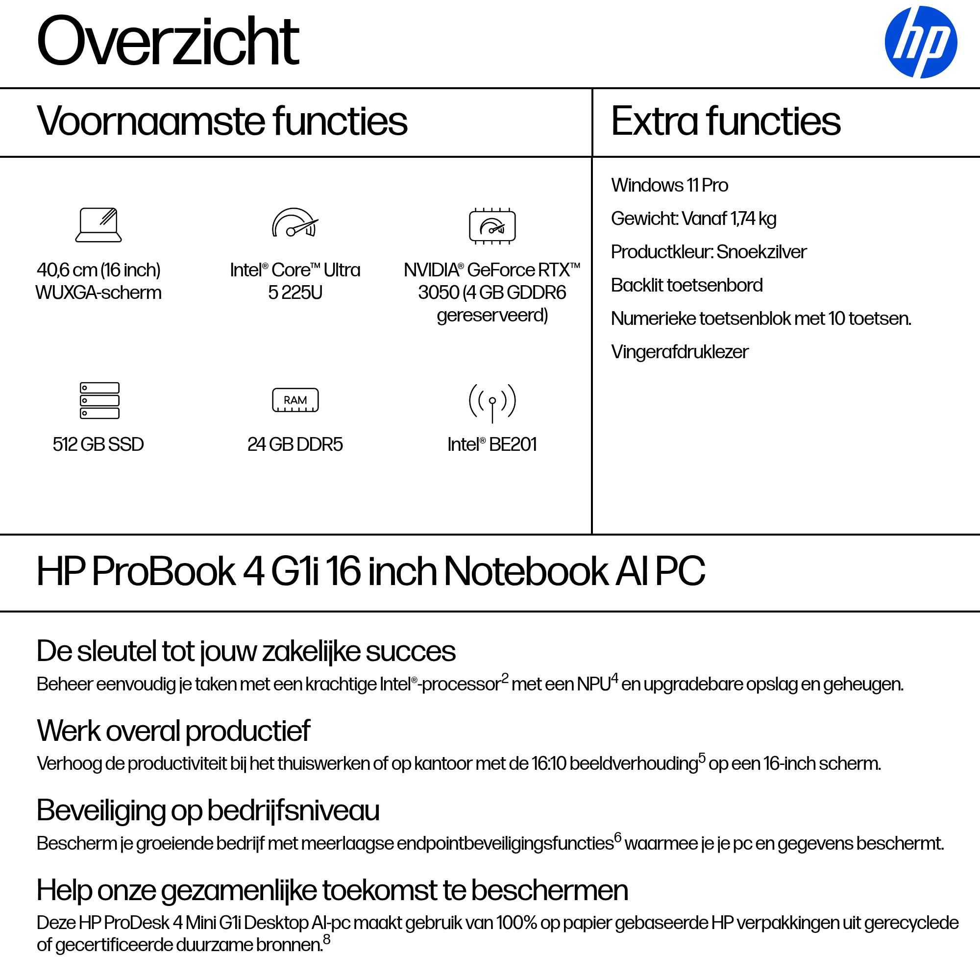 De HP ProBook 4 G1i 16-inch AI-laptop biedt groeiende bedrijven topprestaties, meerlaagse endpointbeveiliging[6] en duurzaamheid in een eenvoudig te upgraden ontwerp. Dankzij de nieuwste Intel-processor[2] met 11 TOPS NPU[4] en lange batterijduur is deze functierijke pc goed uitgerust voor langdurige productiviteit en AI.