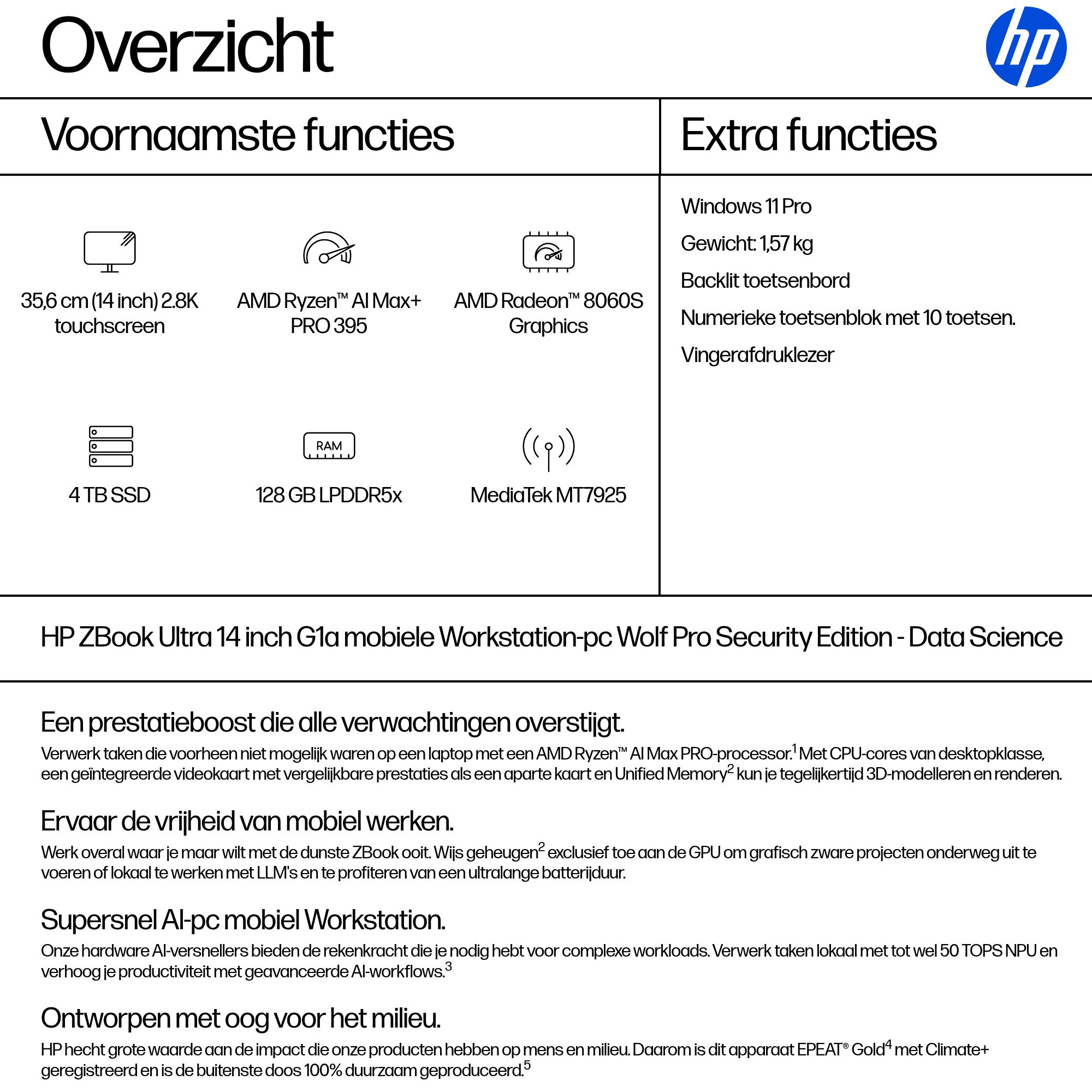 ZBook Ultra 14 inch G1a mobiele Workstation-pc Wolf Pro Security Edition - Data Science, 14", Touchscreen, Windows 11 Pro, AMD Ryzen™ AI Max+ PRO, 128GB RAM, 4TB SSD, 2.8K, AI Workstation; AI PC; Copilot+ PC