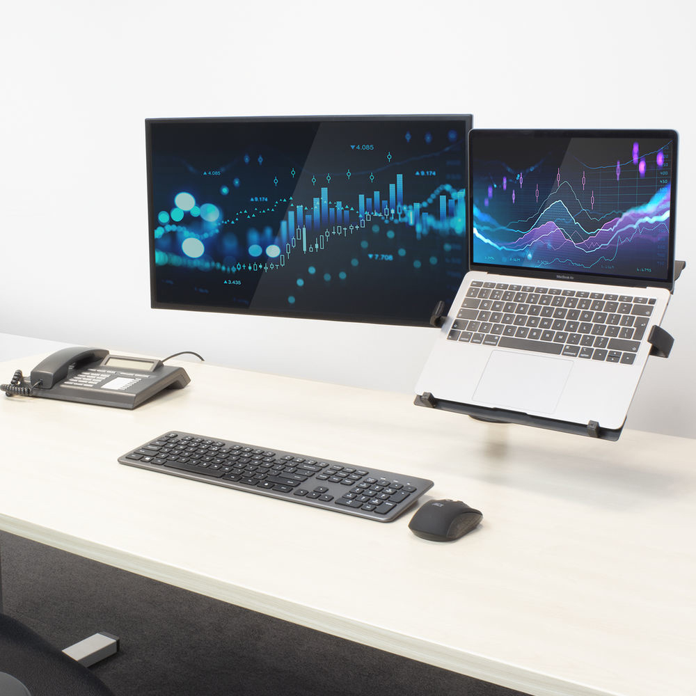 De AC8305 Monitor Bureausteun met laptoparm creëert een ergonomische en plaats besparende werkplek. Bevestig de monitorsteun op of door een bureau (max. tafeldikte 88mm). Plaats eenvoudig een scherm tot 34” en 8kg op de AC8305 met het beeldschermmontagesysteem. De arm met daaraan de laptopsteun is geschikt voor een laptop tot 15,6” en 4kg. De steun heeft drie knikpunten voor het instellen van de ideale kijkafstand. De monitor en de laptop zijn op de gewenste kijkhoek te plaatsen door deze te kantelen, te roteren of te zwenken. De kabels kunnen worden weggewerkt met het kabelmanagementsysteem.