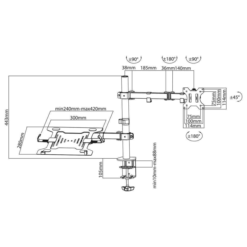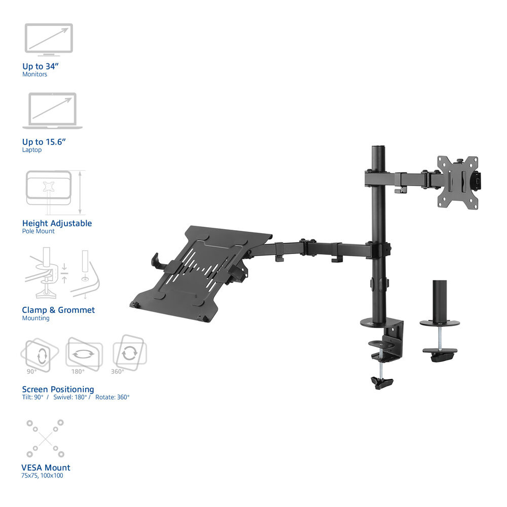 ACT Monitorarm 34" met laptophouder, 1 scherm, Laptop & monitorarm, Zwart, Aluminium, Kunststof, Staal, 25,4 cm (10"), 86,4 cm (34"), 15 kg