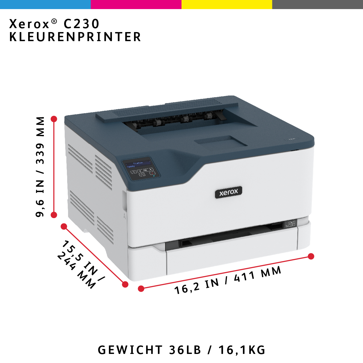 De betaalbare Xerox C230 kleurenprinter is ontwikkeld voor snelle, flexibele kantoren en thuiskantoren die een kleurenprinter nodig hebben die hen bij kan houden. Eenvoudig te instellen met Xerox® Smart Start software en direct gebruiksklaar uit de doos. Dit apparaat is ontworpen voor veeleisende printomgevingen, met een gebruiksvriendelijke interface, automatisch dubbelzijdig printen op A4-formaat en standaard papiercapaciteit van 250 vel. Dankzij de geïntegreerde functionaliteit van draadloze en Wi-Fi Direct kunt u direct vanaf mobiele apparaten en tablets printen. Ontworpen met een aanbevolen maandelijkse printvolume van maximaal 1.500 pagina's per maand, een 1 GHz Dual-Core processor, 256 MB geheugen en printsnelheden van maximaal 24 Letter ppm/22 A4 ppm, is de C230 is een echt werkpaard. Het behalen van de EPEAT-certificering betekent dat de C230 kleurenprinter voldoet aan uitgebreide criteria voor ontwerp, productie, energieverbruik en recycling. Ons Green World Alliance-programma biedt probleemloze recycling van tonercartridges.