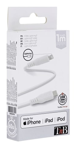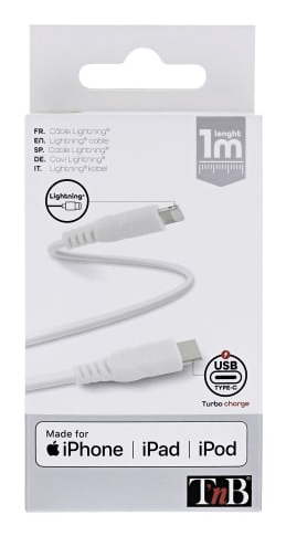 T'nB CBLTC01WH. Snoerlengte: 1 m, Aansluiting 1: Lightning, Aansluiting 2: USB C. Certificaten van naleving: CE, Certificering: MFi. Aantal per verpakking: 1 stuk(s), Type verpakking: Hangende doos