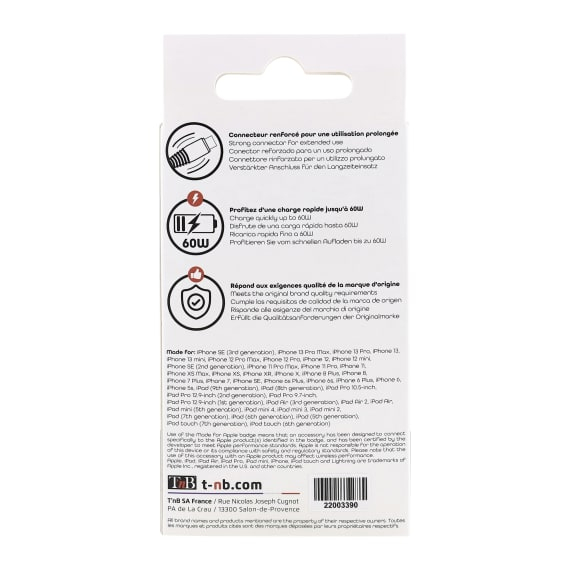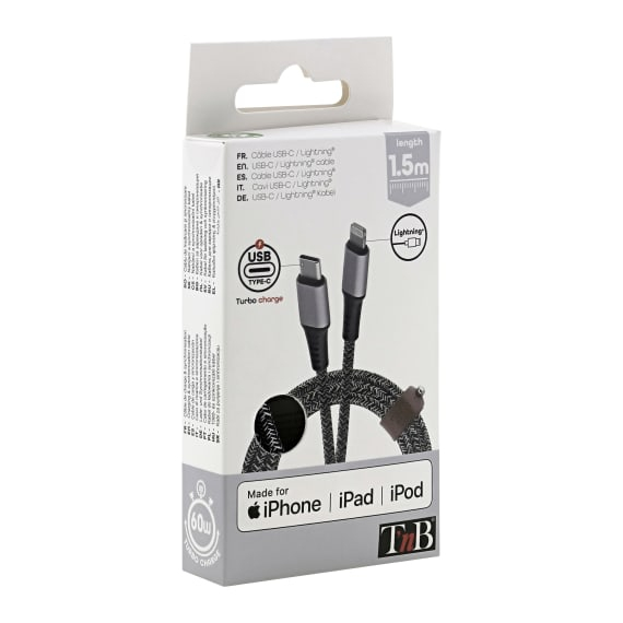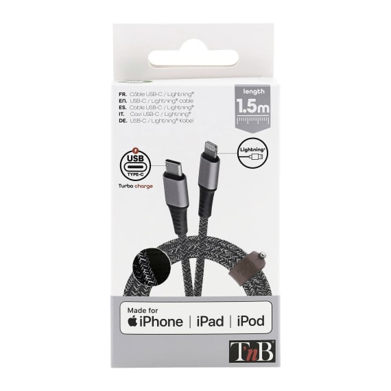 T'nB CBLTCLTD. Snoerlengte: 1,5 m, Aansluiting 1: Lightning, Aansluiting 2: USB C. Aantal per verpakking: 1 stuk(s), Breedte verpakking: 65 mm, Diepte verpakking: 20 mm