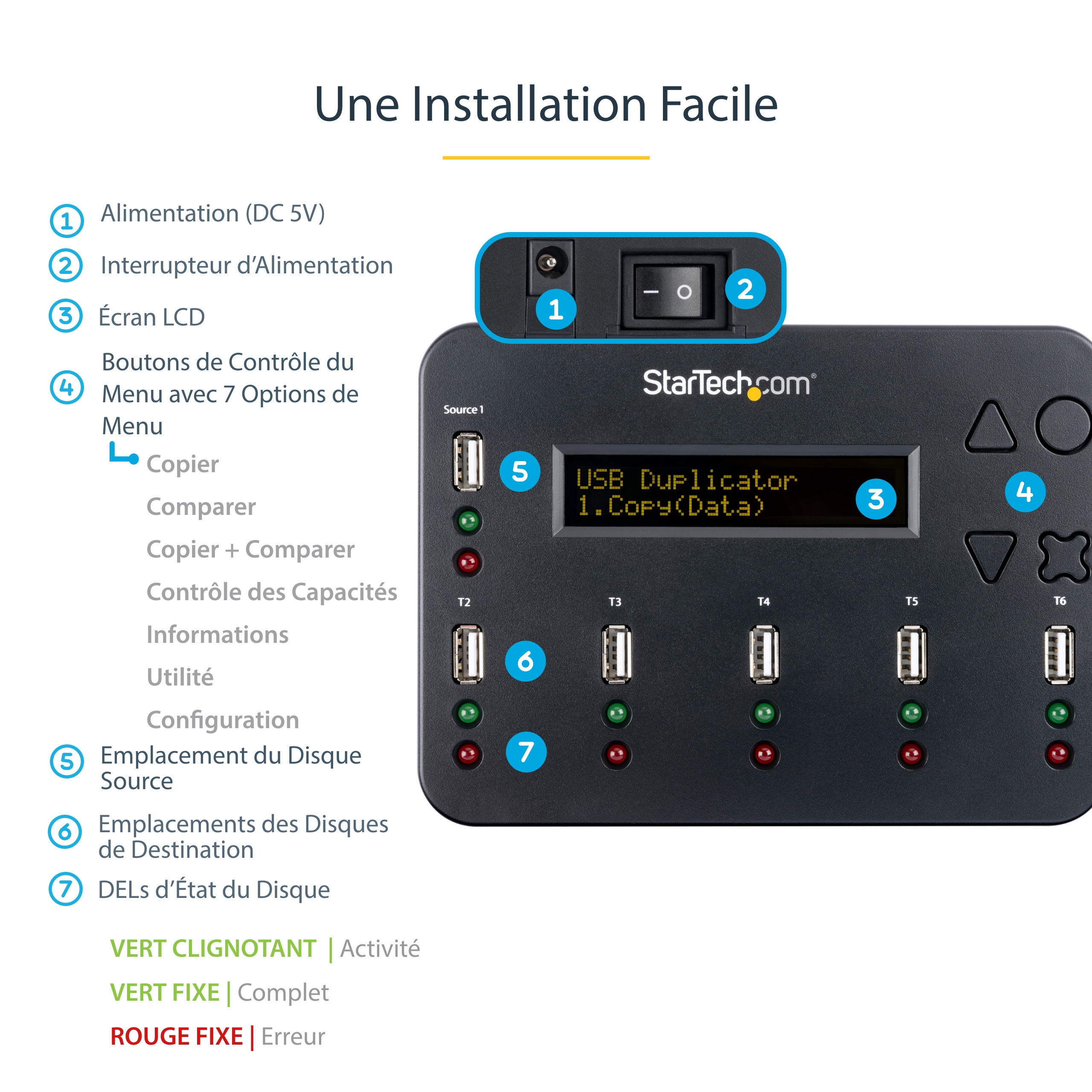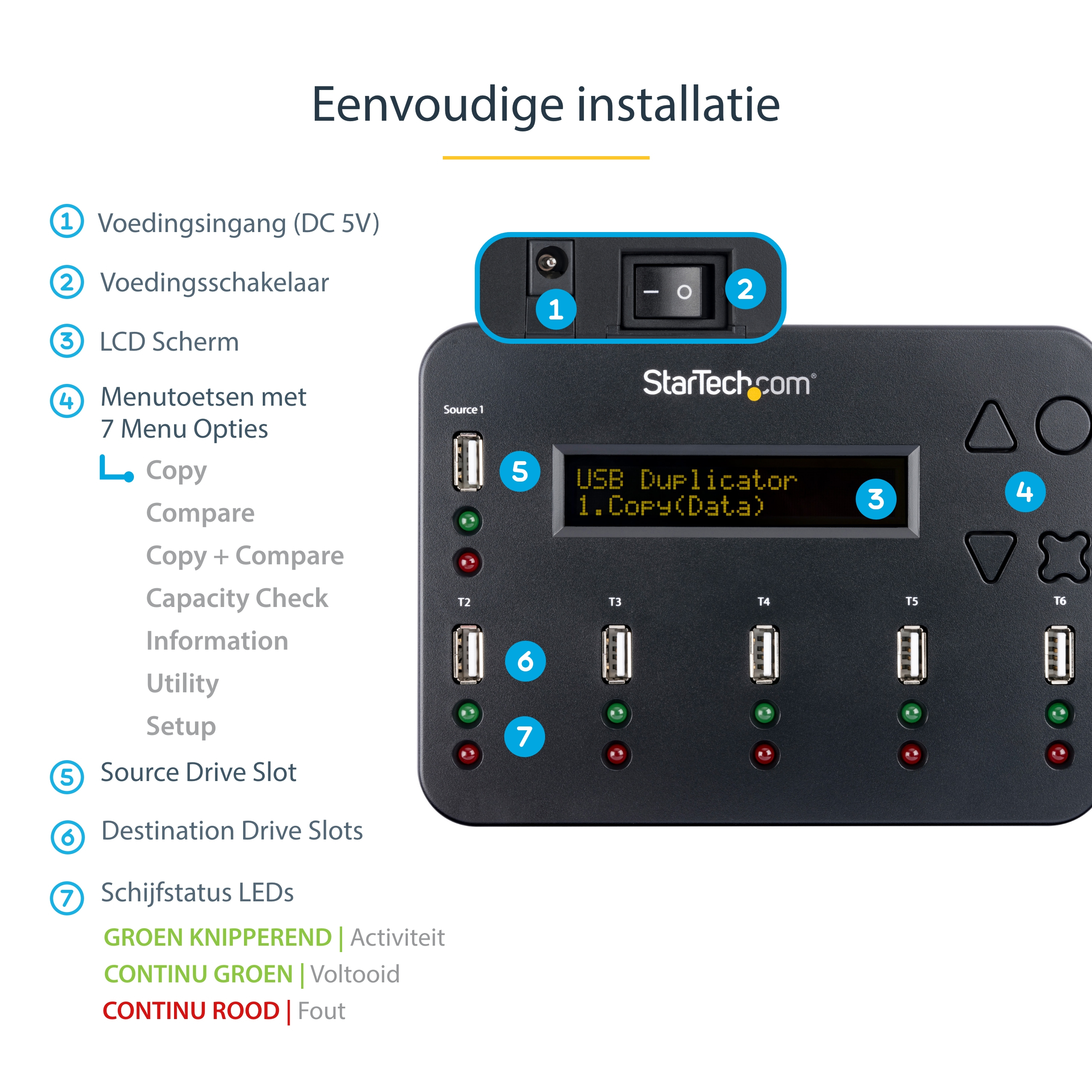 Met een gemakkelijk leesbaar LCD-scherm en intuïtieve menubediening met vier toetsen garandeert de USBDUP15 probleemloze installatie en bediening. In het menu hebt u met drukknoppen toegang tot vele waardevolle functies, waardoor het takenbeheer wordt vereenvoudigd zoals: capaciteit & snelheidscontrole, kopiëren & vergelijken, asynchroon kopiëren en nog veel meer. Het biedt ook talrijke geavanceerde instelopties voor ervaren gebruikers.