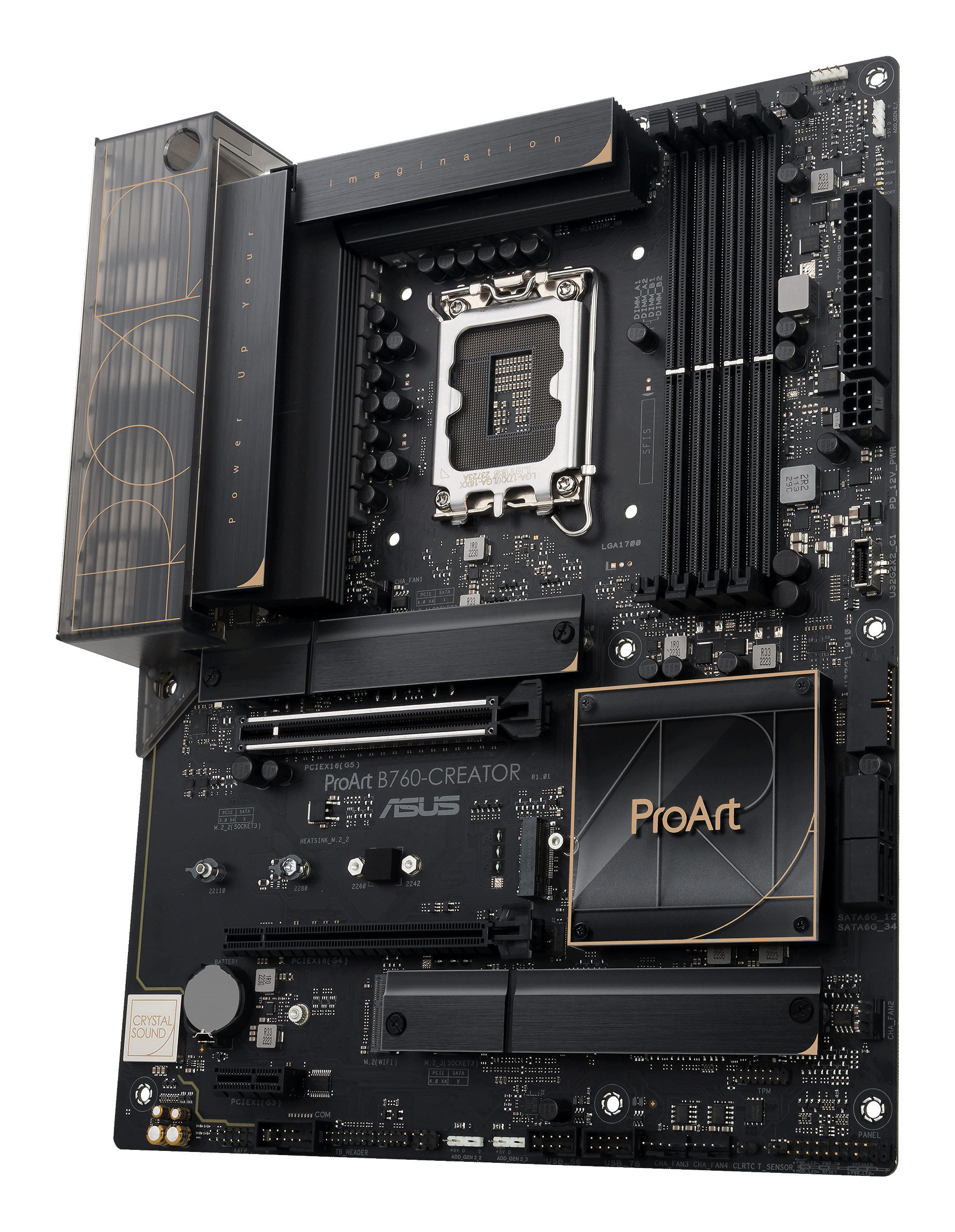 ASUS PROART B760-CREATOR. Processorfabrikant: Intel, Processor socket: LGA 1700, Compatibele processors: Intel® Celeron®, Intel® Pentium® Gold, Intel® Core™ i3, Intel® Core™ i5, Intel® Core™.... Ondersteunde geheugen types: DDR5-SDRAM, Maximum intern geheugen: 128 GB, Geheugen slots type: DIMM. Ondersteunde opslagstationinterfaces: M.2, SATA III, Ondersteunde types opslag-drives: HDD & SSD, Soorten RAID: 0, 1, 5, 10. Ethernet interface type: 2.5 Gigabit Ethernet. Component voor: PC, Moederbord form factor: ATX, Moederbord chipset familie: Intel