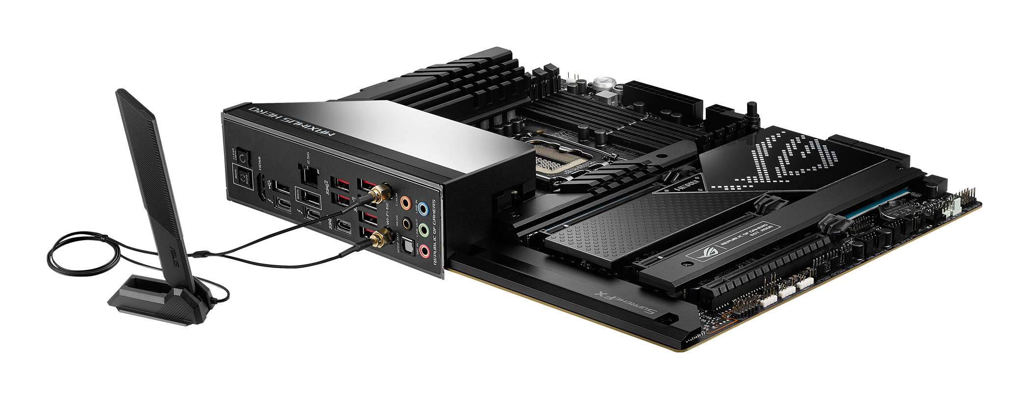 ASUS ROG MAXIMUS Z690 HERO. Processorfabrikant: Intel, Processor socket: LGA 1700, Compatibele processors: Intel® Celeron®, Intel® Core™ i3, Intel® Core™ i5, Intel® Core™ i7, Intel® Core™ i9,.... Ondersteunde geheugen types: DDR5-SDRAM, Maximum intern geheugen: 192 GB, Geheugen slots type: DIMM. Ondersteunde opslagstationinterfaces: M.2, SATA, Ondersteunde types opslag-drives: HDD & SSD, Soorten RAID: 0, 1, 5, 10. Ethernet interface type: 2.5 Gigabit Ethernet, Wifi-standaard: Wi-Fi 6E (802.11ax), Wi-Fi-standaarden: 802.11a, 802.11b, 802.11g, Wi-Fi 4 (802.11n), Wi-Fi 5 (802.11ac), Wi-Fi 6 (802.11ax), Wi-Fi 6E.... Component voor: PC, Moederbord form factor: ATX, Moederbord chipset familie: Intel