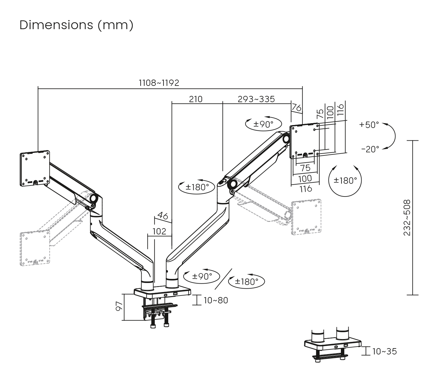 Digitus DA-90474. Montage: Klem, Maximale gewichtscapaciteit: 40 kg, Maximale schermgrootte: 114,3 cm (45"), Montage interface compatibiliteit (min): 75 x 75 mm, Montage interface compatibiliteit (max): 100 x 100 mm. In hoogte verstelbaar, Bereik kantelhoek: -20 - 50°. Kleur van het product: Zwart