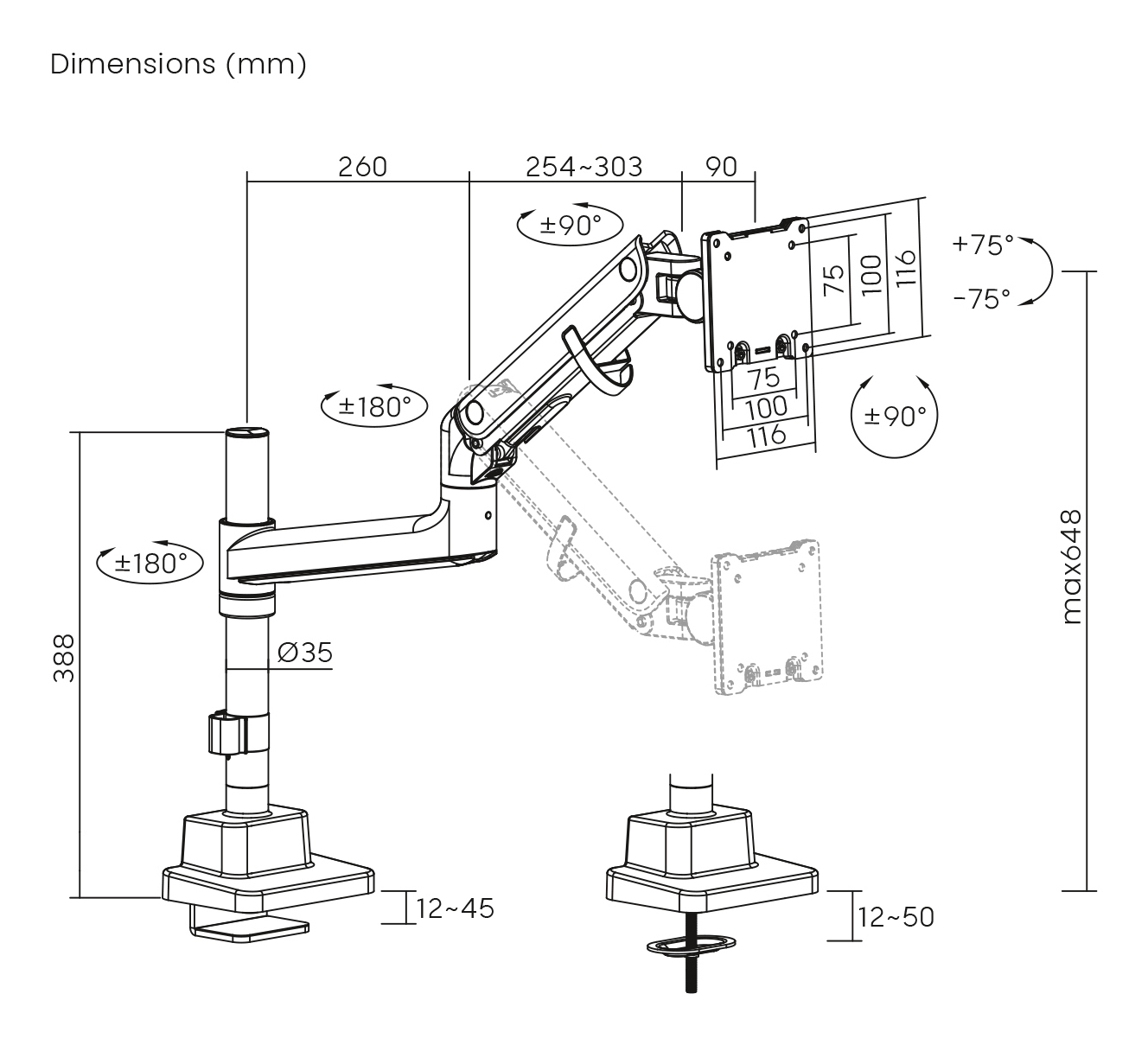 Digitus DA-90475. Montage: Klem, Maximale gewichtscapaciteit: 27 kg, Maximale schermgrootte: 144,8 cm (57"), Montage interface compatibiliteit (min): 75 x 75 mm, Montage interface compatibiliteit (max): 100 x 100 mm. In hoogte verstelbaar, Bereik kantelhoek: -75 - 75°. Kleur van het product: Zwart