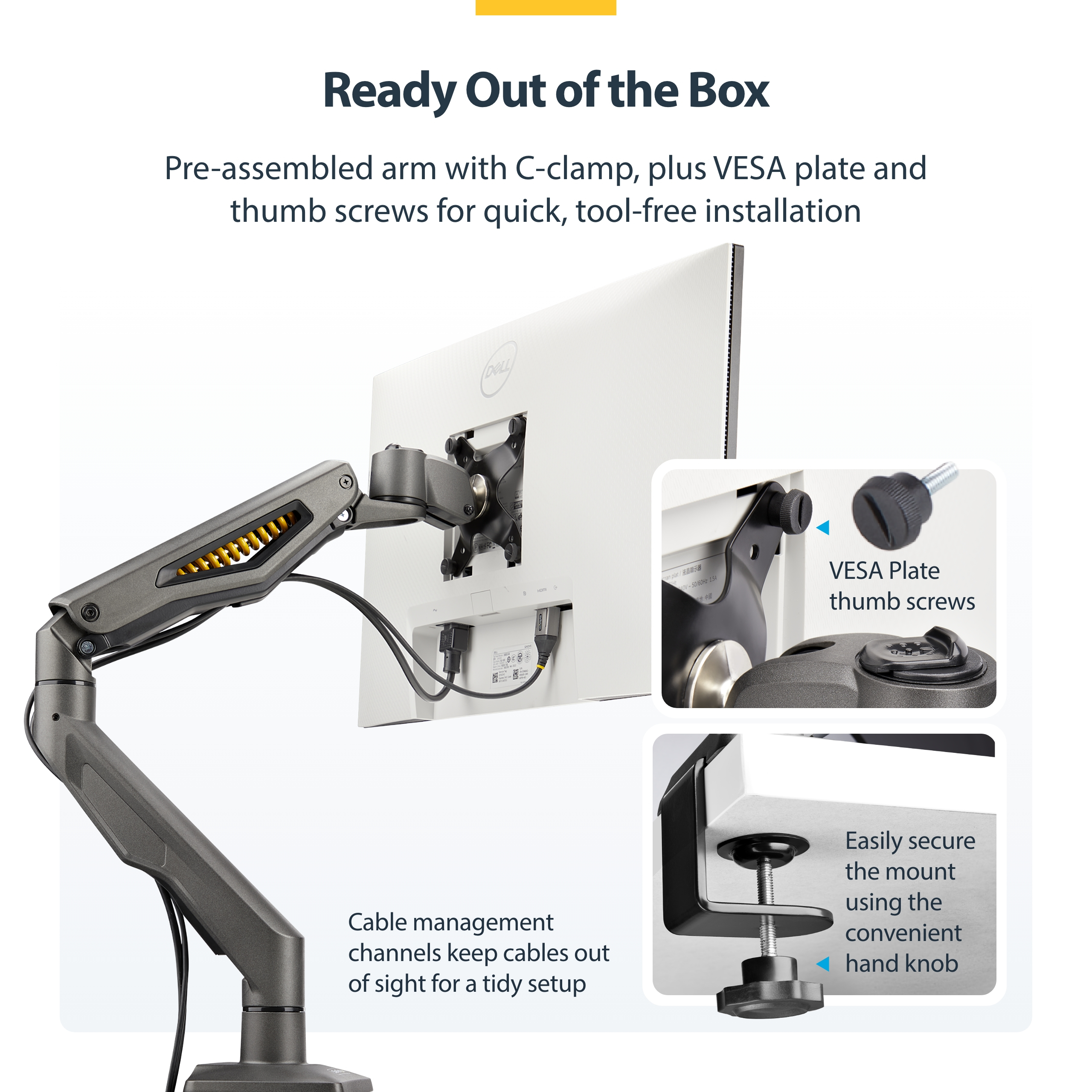 De monitorarm wordt voorgemonteerd geleverd en beschikt over een VESA-monitorplaat met duimschroeven voor een snelle en veilige bevestiging van de monitor, zonder extra gereedschap.