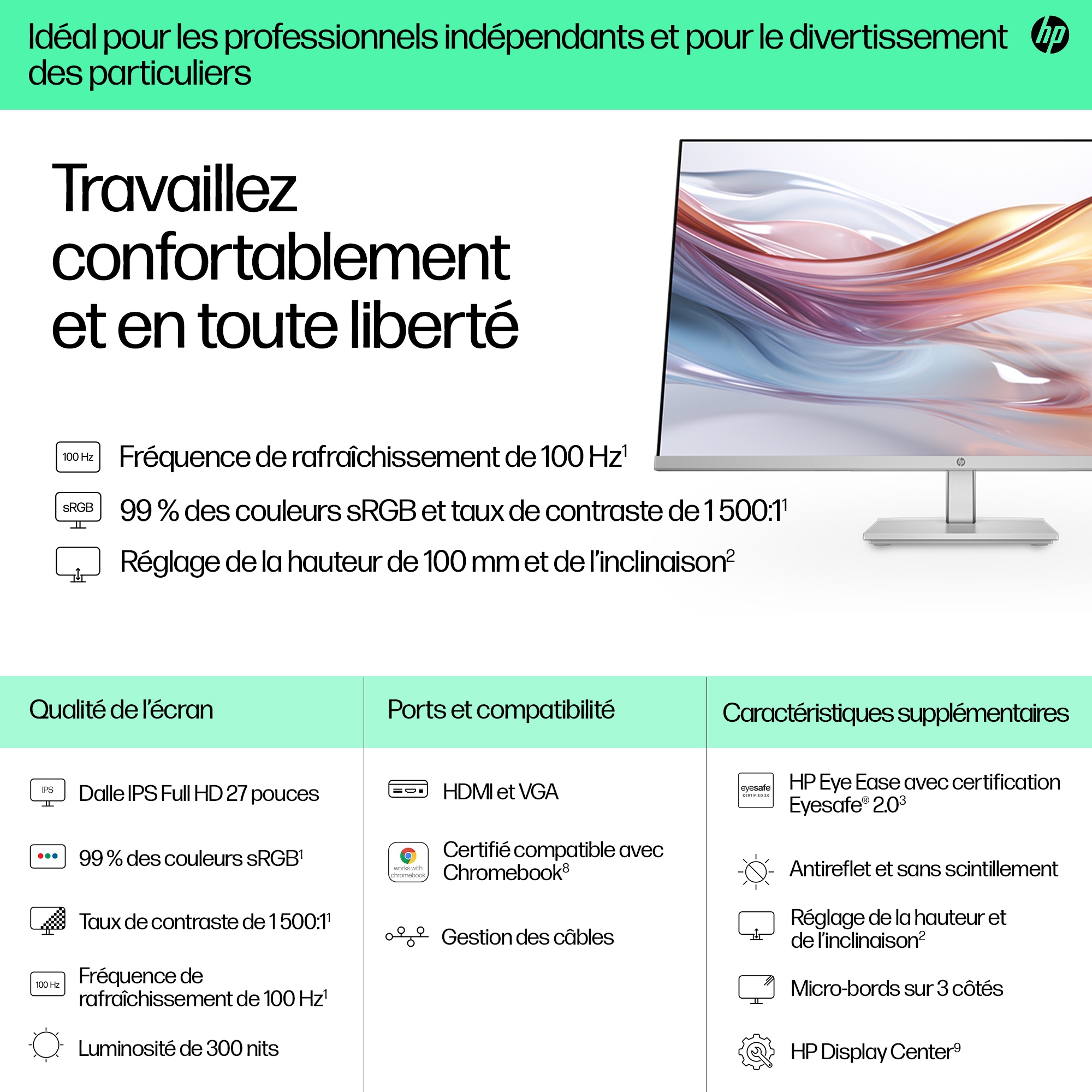 De in hoogte verstelbare HP Serie 5 27 inch FHD-monitor is de perfecte oplossing voor elk project en voor elke vergadering. Het elegante design past in elke werkruimte. En door het prachtige scherm, de verstelbare standaard en het optimale comfort kun je nog productiever werken. Werk nog flexibeler door de verbeterde visuele prestaties, hoge contrastratio en refresh rate.[1]