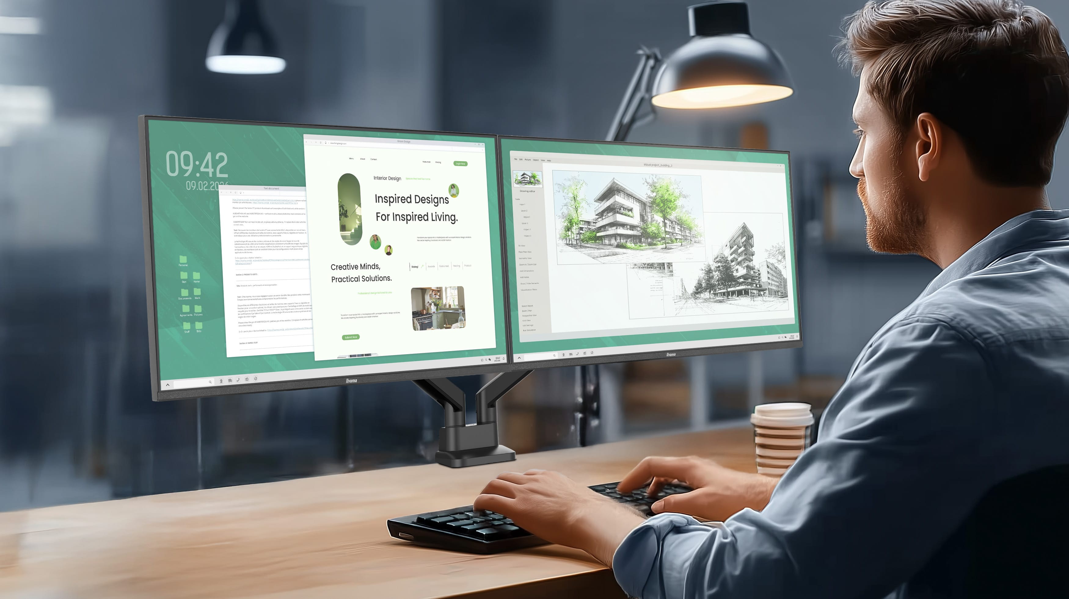 Sluit meerdere monitoren met extra dunne randen aan om een panoramische werkruimte te creëren, uw apps in beeld te houden, multitasking te stroomlijnen en uw productiviteit te verhogen.