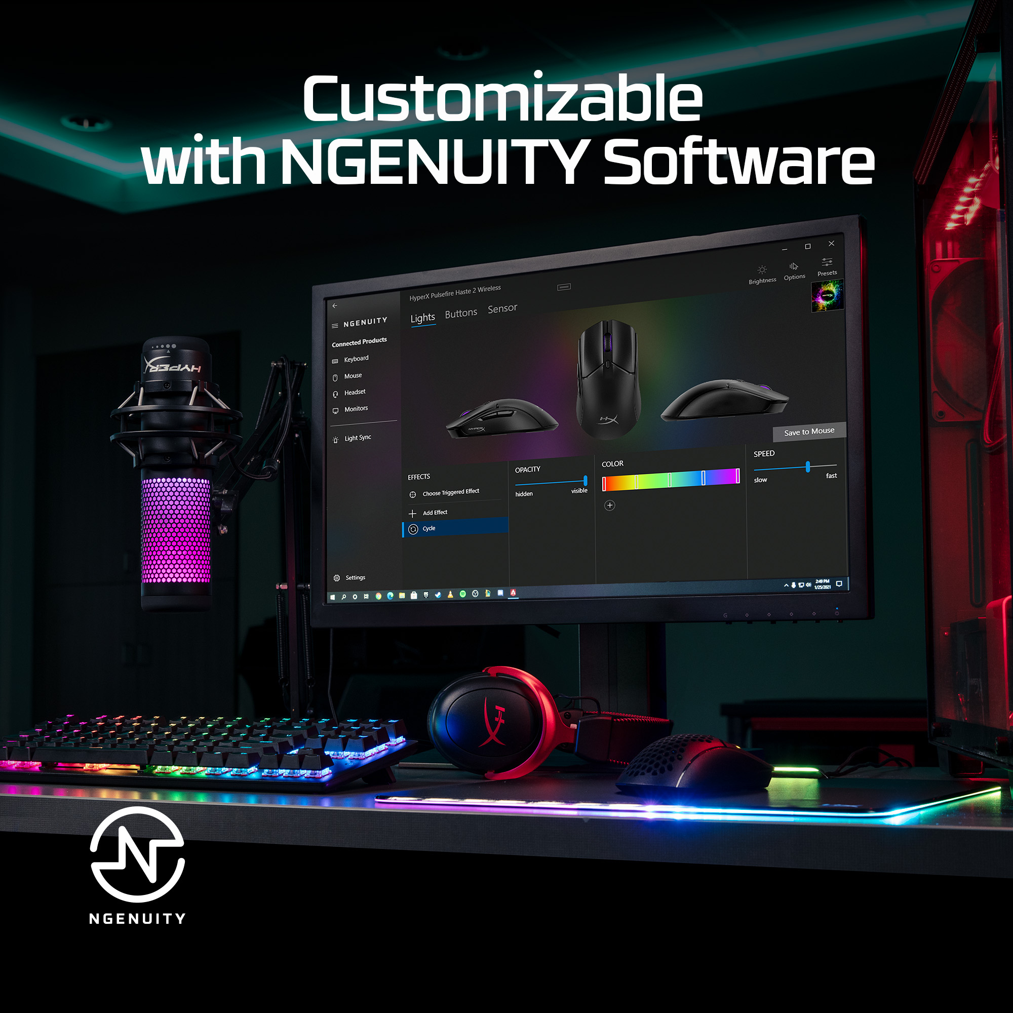 De HyperX Pulsefire Haste 2 Wireless is ontwikkeld voor gamers die het zich niet kunnen veroorloven ook maar een milliseconde te verspillen en de vrijheid willen om draadloos verbinding te maken. Deze opvolger heeft een harde behuizing en nog steeds het gewicht van 61 gram[3] en de batterijduur van 100 uur[2] van de oorspronkelijke Pulsefire Haste, maar bouwt daarop voort met verschillende verbeteringen. De Pulsefire Haste 2 Wireless biedt draadloze verbinding in 2 standen, waardoor je kunt wisselen tussen een draadloze verbinding van 2,4 GHz en Bluetooth. Ook heeft hij een oplaadkabel waarmee je de muis kunt opladen als je hem met de kabel gebruikt. We hebben ook een volledig pakket van krachtig presterende, aangepaste HyperX-componenten ontwikkeld, met als hoogtepunt de precieze HyperX 26K-sensor met een standaard DPI van maximaal 26.000 en een trackingsnelheid van maximaal 650 IPS. Onze aangepaste HyperX-switches laten je elke klik op een prettige manier voelen en horen en zijn beoordeeld voor een levensduur van tot 100 miljoen klikken. Daarnaast heb je uitstekende fysieke controle over de muis met soepele skates met weinig frictie en de meegeleverde anti-sliptape. Benut elke muisbeweging maximaal met HyperX NGENUITY-software en maak macro’s voor de zes programmeerbare knoppen, pas je DPI-instellingen aan en stel de RGB-verlichting in naar je eigen wensen.