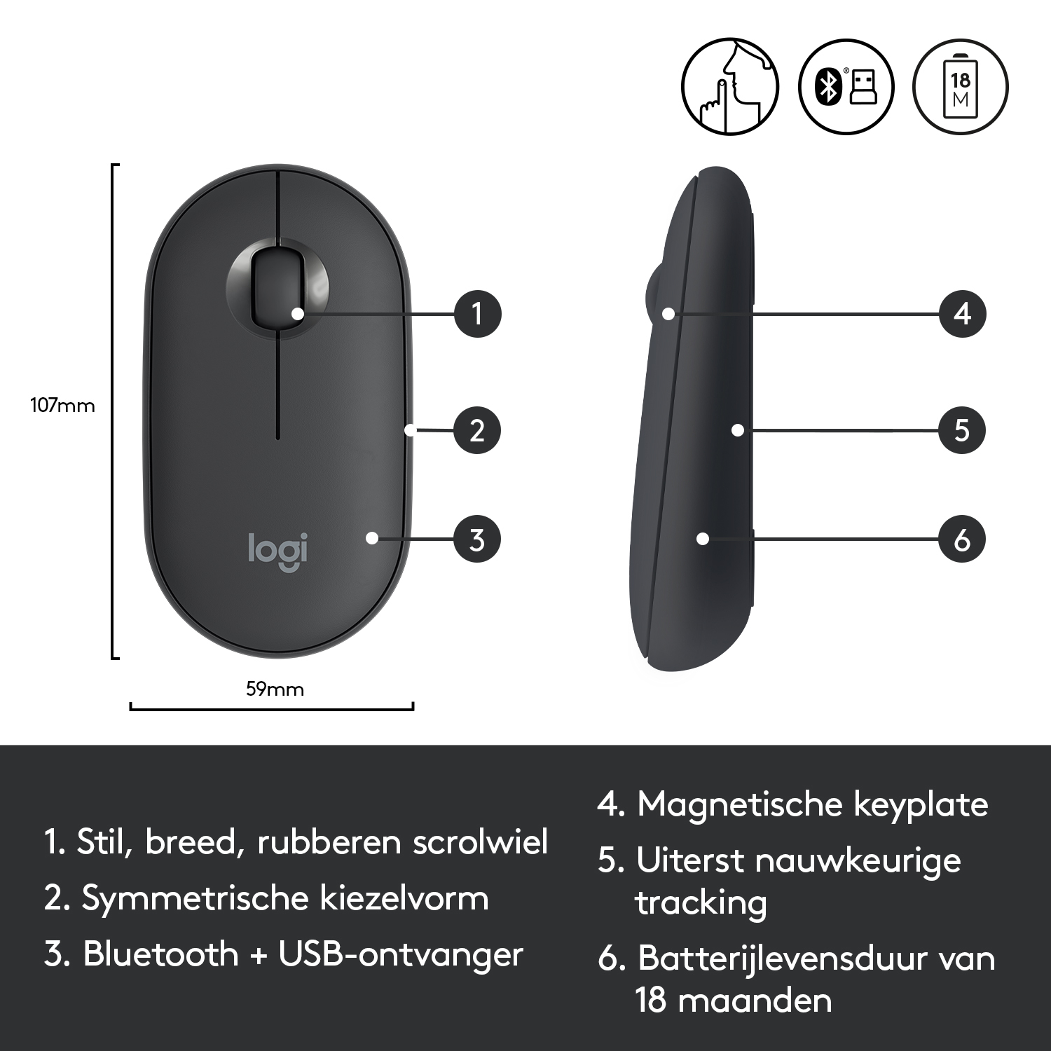 Logitech Pebble M350, Ambidextrous, Optisch, RF-draadloos + Bluetooth, 1000 DPI, Grafiet