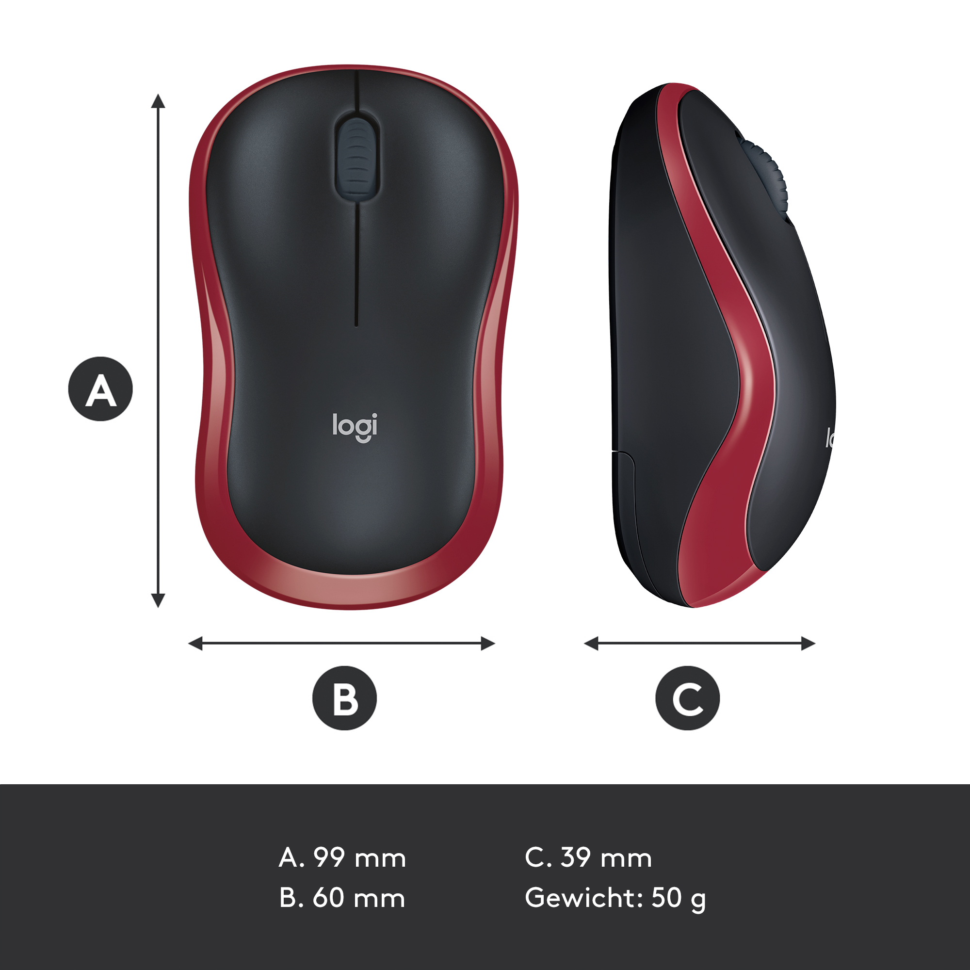 Logitech M185, Ambidextrous, Optisch, RF Draadloos, 1000 DPI, Rood