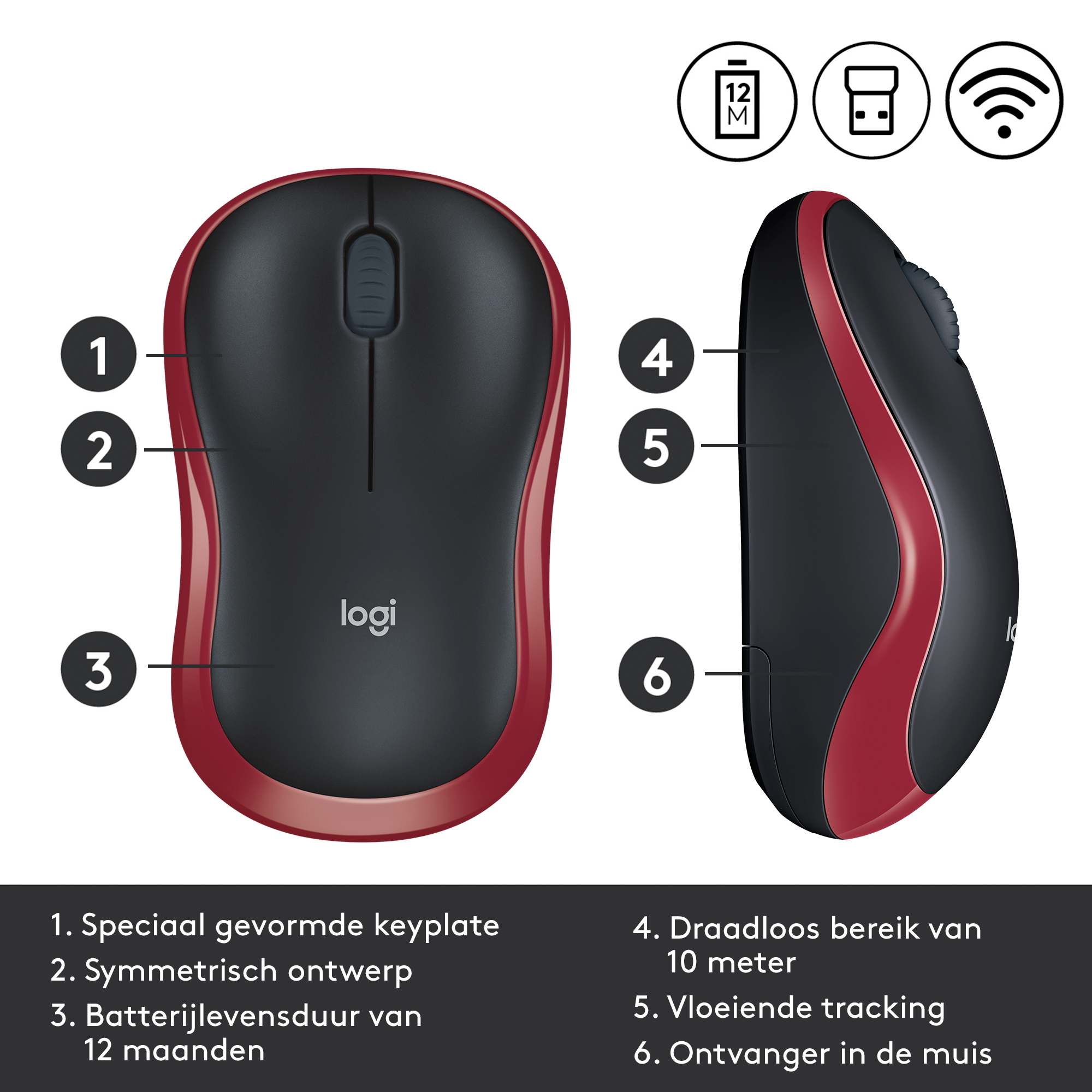 De muis is ontwikkeld volgens dezelfde hoge kwaliteitsnormen die Logitech tot een wereldleider op het gebied van muizen en toetsenborden hebben gemaakt2Gebaseerd op onafhankelijke verkoopgegevens (in eenheden) voor Logitech-muizen en -toetsenborden geaggregeerd van belangrijke wereldwijde markten, waaronder Canada, China, Frankrijk, Duitsland, Indonesië, Zuid-Korea, Rusland, Zweden, Taiwan, Turkije, VK en VS (van juli '19 tot juli '20). Alleen winkelkanaal.. De M185 is duurzaam en betrouwbaar en werkt max. 12 maanden3Batterijlevensduur is afhankelijk van gebruiks- en computeromstandigheden.zonder de batterijen te vervangen, dankzij de aan/uit-knop en de automatische, energiebesparende slaapstand.