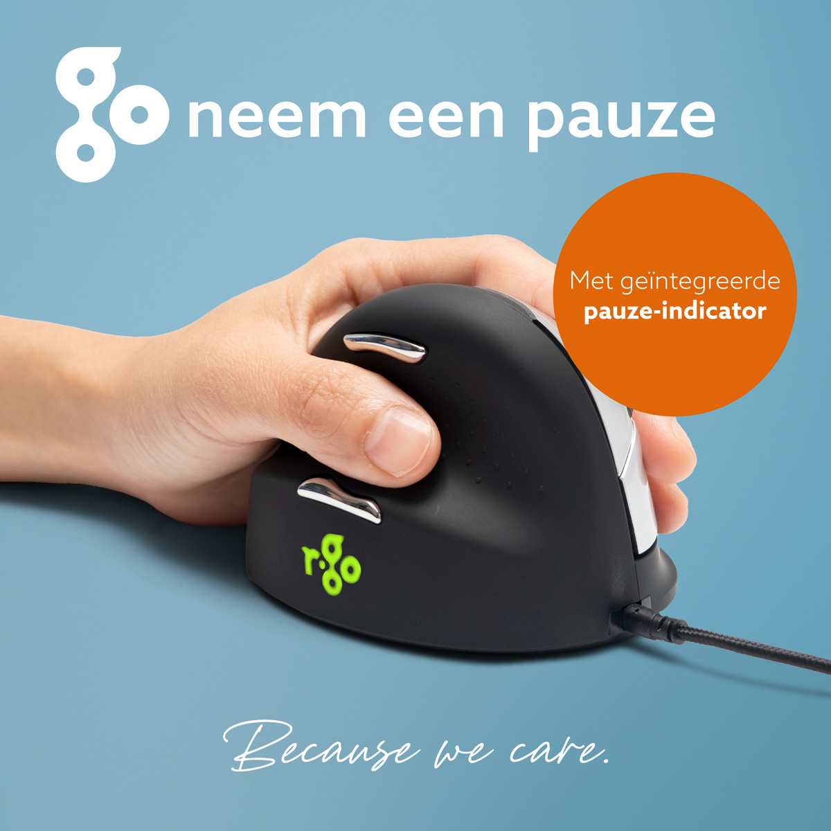 De R-Go HE Break Muis is een ergonomische verticale muis met geïntegreerde pauzesoftware. Deze slimme muis helpt je herinneren wanneer het tijd is voor een pauze. De R-Go HE Break muis heeft een verticale stand, waardoor je de muis automatisch met je onderarm zult bewegen in plaats van alleen je hand. Hiermee voorkom je overbelastingsklachten, zoals RSI- klachten. De HE Break muis heeft een ronde vorm, zodat je hand en pols in een natuurlijke, ontspannen stand staan. De muis ligt prettig in de hand en ondersteunt alle vingers. Ben je links- of rechtshandig? We hebben verschillende versies en maten beschikbaar, zodat de muis in elke hand past. De LED- kleursignalen in de muis geven aan hoe gezond je werkt en wanneer het tijd is voor een pauze. De muis stimuleert je om op frequente basis pauzes te nemen. Deze vitale onderbrekingen helpen om overbelasting te voorkomen, stimuleren de doorbloeding van het lichaam en houden je fit tijdens je werkdag. Tijdens het muisgebuik verandert het lampje van kleur, zoals bij een stoplicht. Groen betekent ‘goed bezig’, oranje dat het tijd is voor een pauze, rood dat je te lang hebt doorgewerkt. Door gebruik te maken van deze subtiele kleursignalen ontvang je op een eenvoudige en positieve wijze feedback over gezond (pauze)gedrag. Dit product werkt samen met de R-Go Break Software dat de Benelux Office Products Award 2021 heeft gewonnen.