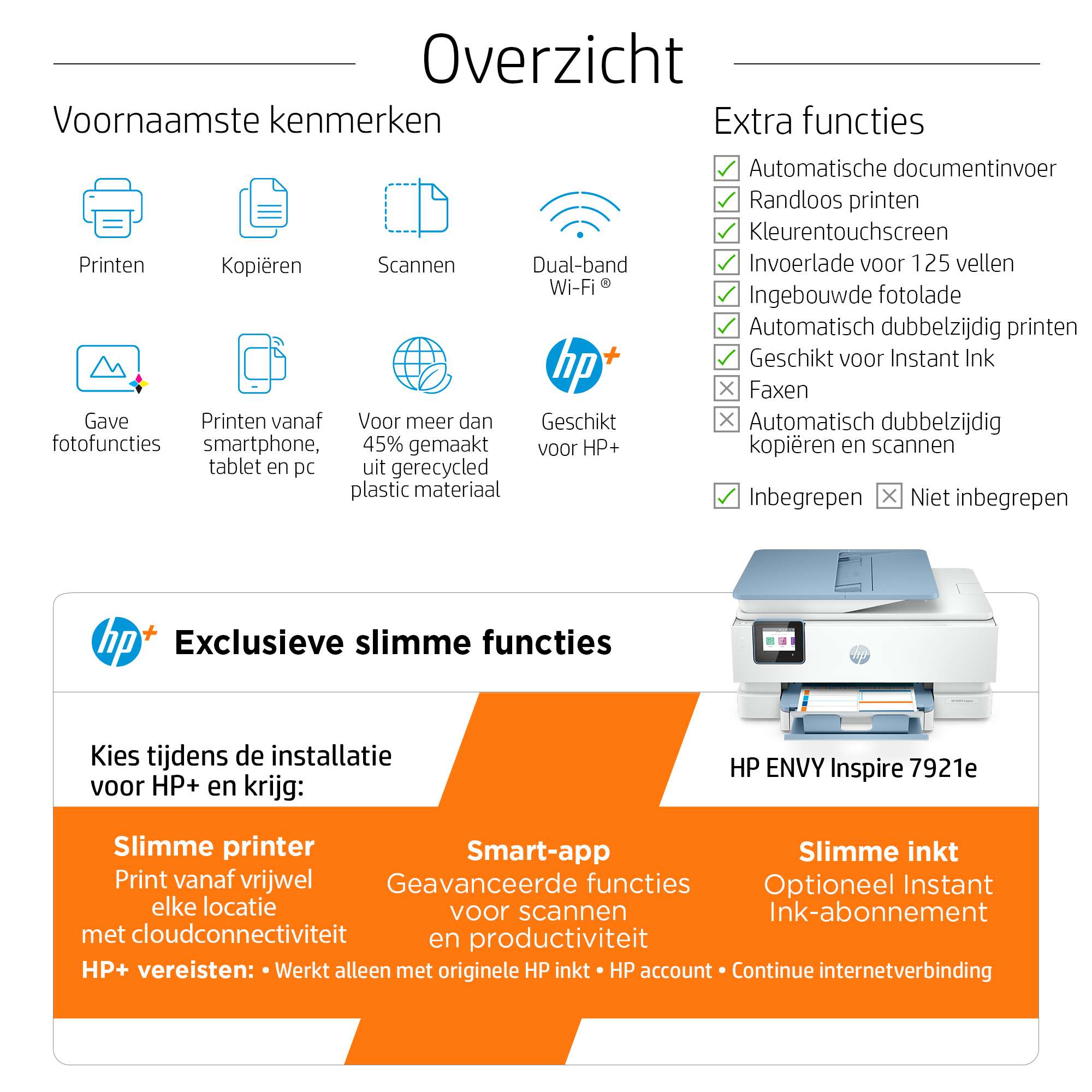 Dit is een printer die HP+ ondersteunt. Kies voor HP+ bij de installatie van het product om de voordelen te activeren. Voor HP+ is een HP account, continue verbinding met het internet en exclusief gebruik van originele HP inktcartridges tijdens de gehele levensduur van de printer vereist. Meer informatie op: http://www.hp.com/plus