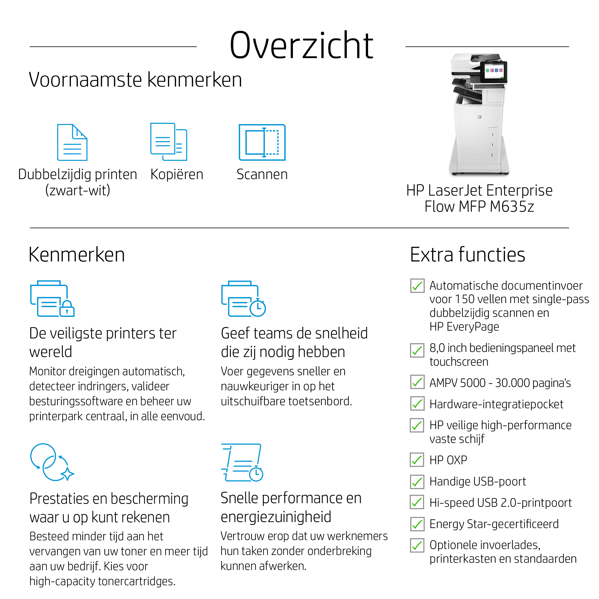 HP LaserJet Enterprise Flow MFP M635z, Laser, Zwart-wit afdrukken, 1200 x 1200 DPI, A4, Direct printen, Zwart, Wit