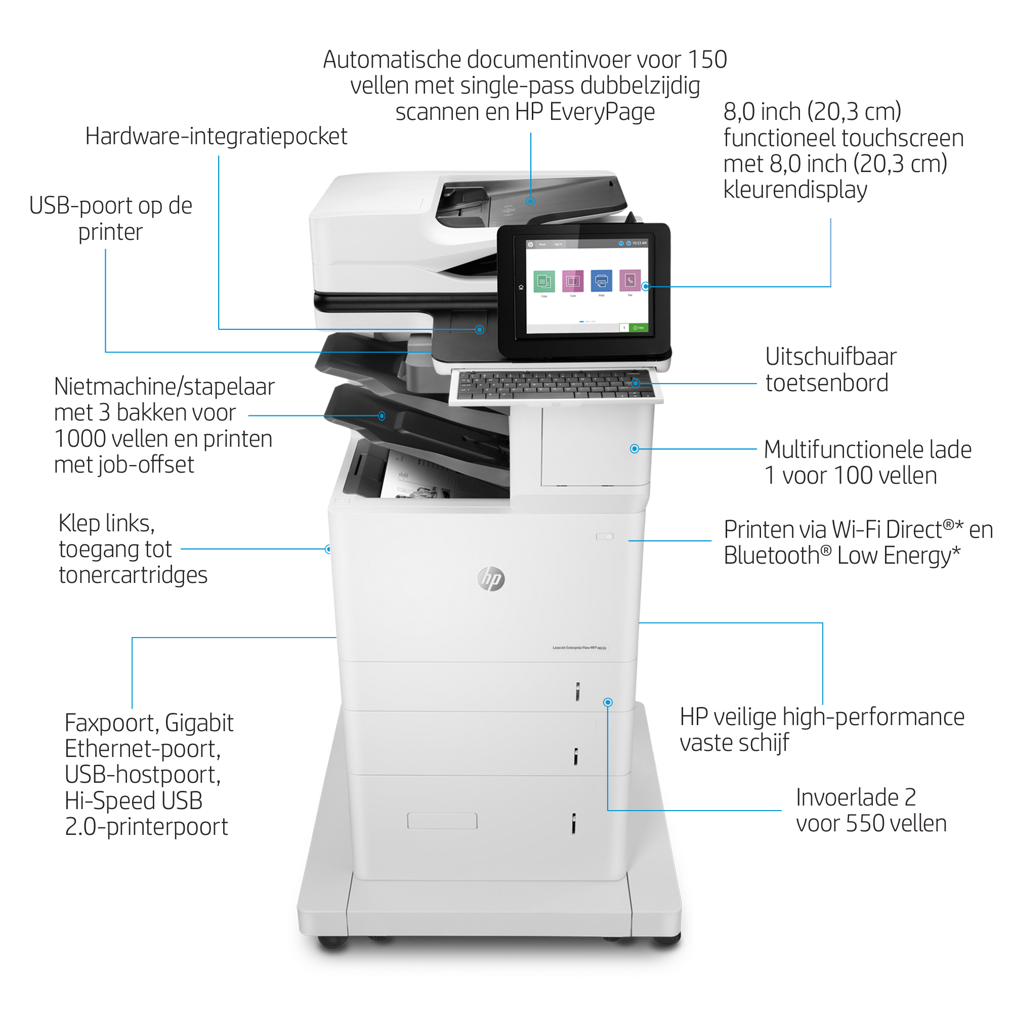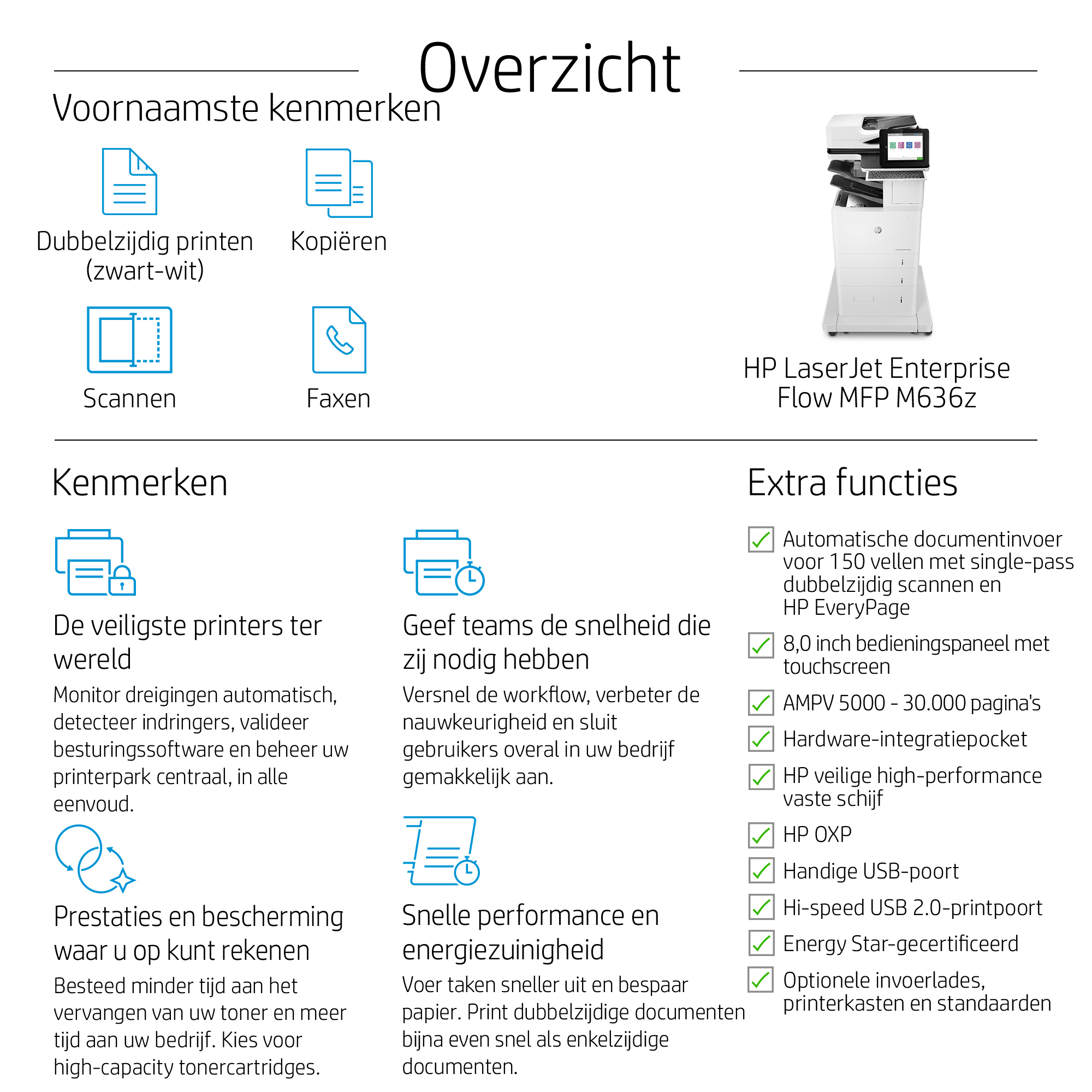 HP LaserJet Enterprise Flow MFP M636z, Laser, Zwart-wit afdrukken, 1200 x 1200 DPI, A4, Direct printen, Zwart, Wit