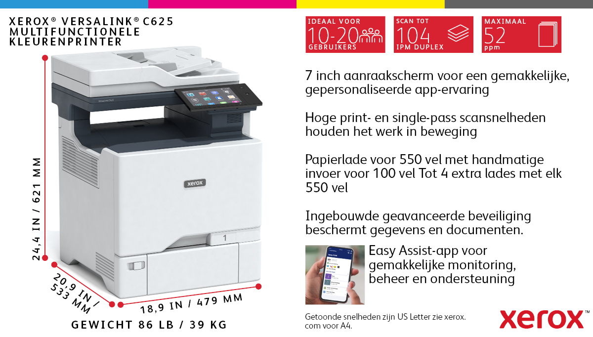 VersaLink C625 A4 50 ppm dubbelzijdig kopiëren en printen, scannen en faxen, geschikt voor PS3 PCL5e/6 2 laden voor max. 650 vel
