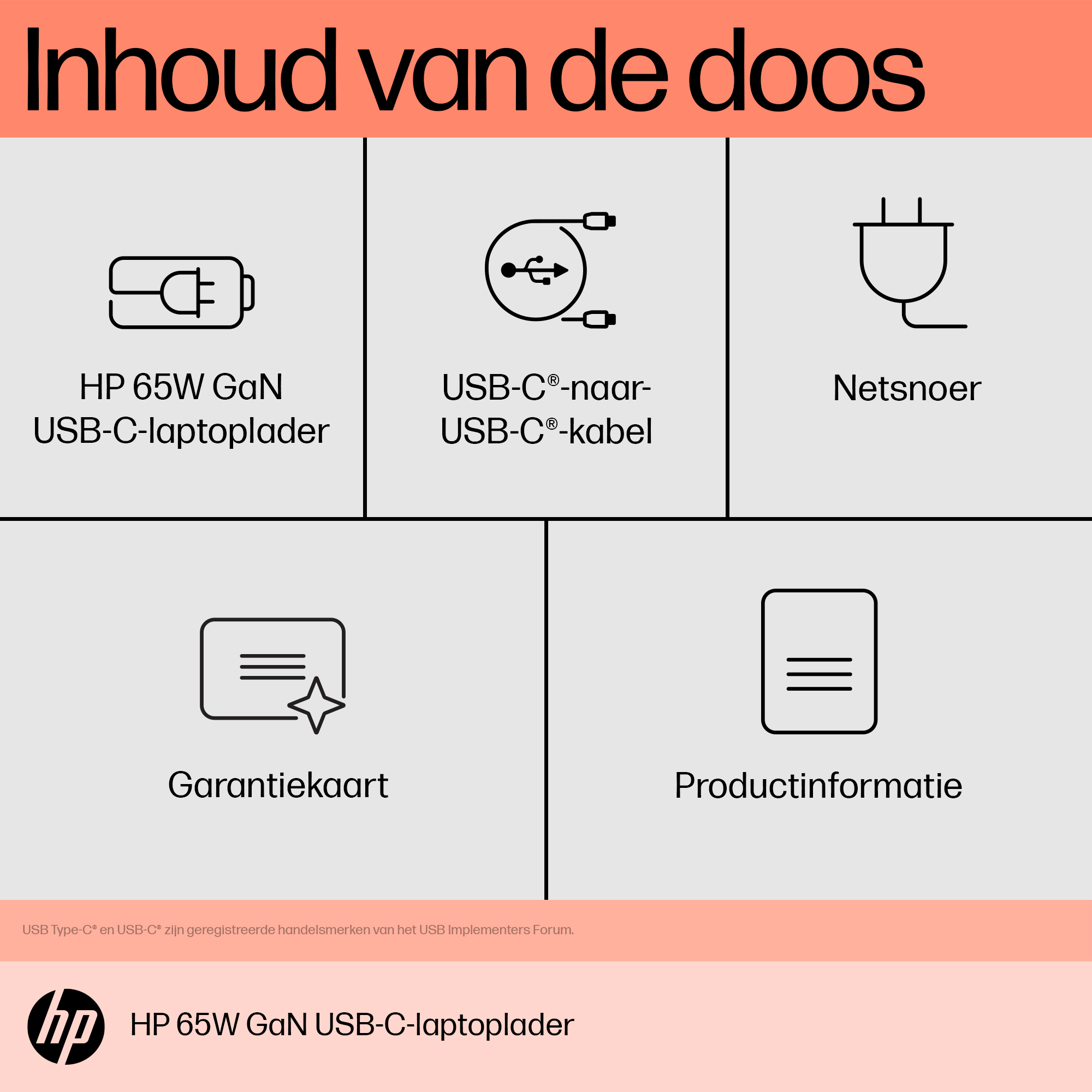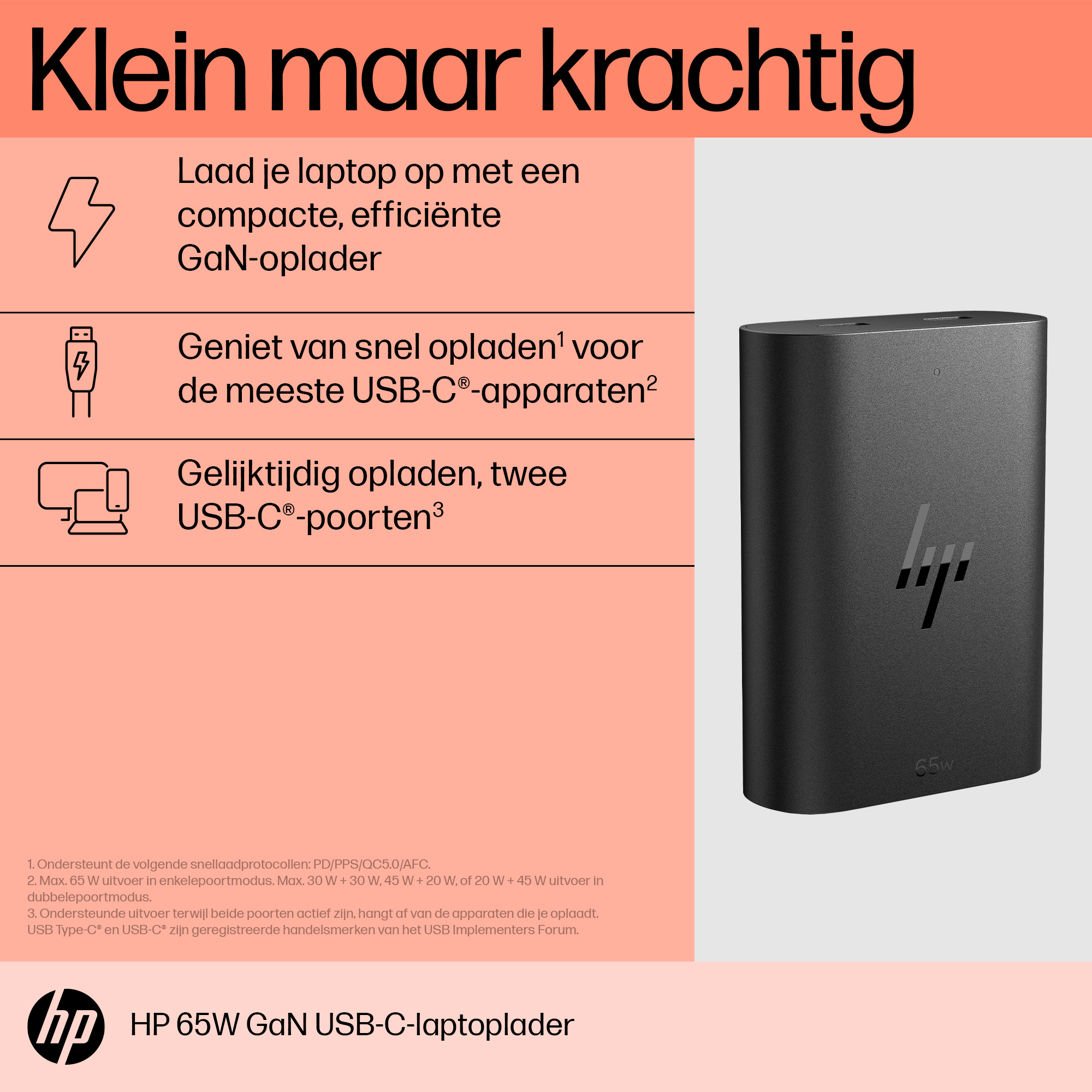 HP 65W GaN USB-C laptoplader, Laptop, Binnen, 65 W, 5,9,12,15,20 V, 65 W, Ondersteunt tot 65 W voeding