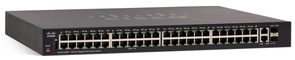 Cisco SG250-50P-K9-EU-RF. Switch type: Managed, Switch-laag: L2/L3. Type basis-switching RJ-45 Ethernet-poorten: Gigabit Ethernet (10/100/1000), Aantal basis-switching RJ-45 Ethernet-poorten: 48, Aantal USB 2.0-poorten: 1. MAC-adrestabel: 8000 entries, Switchingcapaciteit: 100 Gbit/s. Netwerkstandaard: IEEE 802.1D, IEEE 802.1Q, IEEE 802.1p, IEEE 802.1s, IEEE 802.1w, IEEE 802.1x, IEEE 802.3, IEEE.... Power over Ethernet (PoE). Rack-montage, Vormfactor: 1U